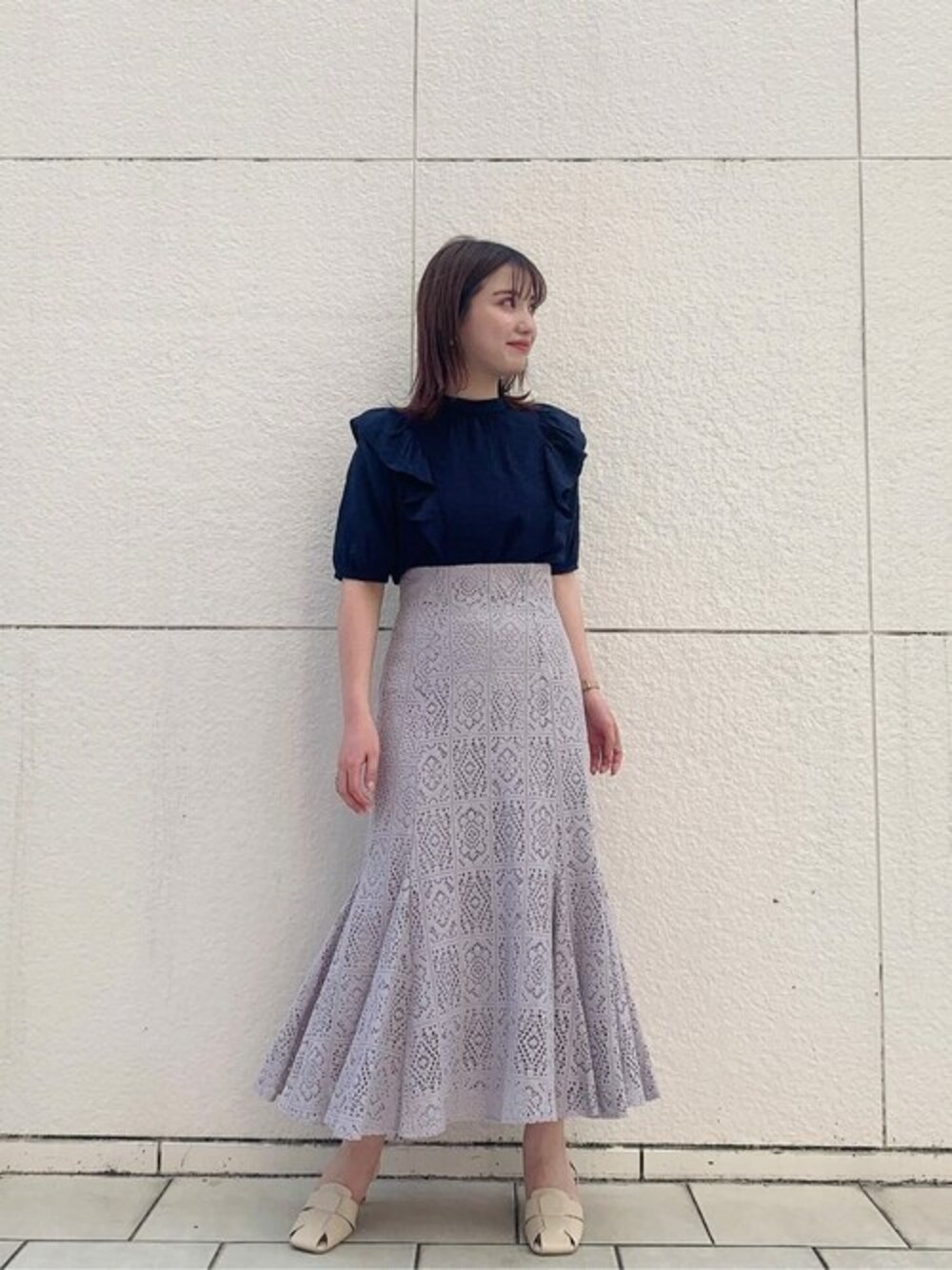 158cm/骨格ストレート/イエベ春 【着用サイズ】ブラウス:M スカート:M 【普段サイズ】 ブラウス:S スカート:S ブラウス→柔らかく、着心地の良い素材になっています。 シンプルなブラウスにラッフルデザインがあることで大人可愛い雰囲気になります♡ 通勤からオフまで着回しのきく1枚です。 スカート→ボーダー調のレースが華やかな印象に演出してくれます♪ ハイウエストなので腰回りがスッキリ見えて、裾の揺れ感が綺麗なスカートです!