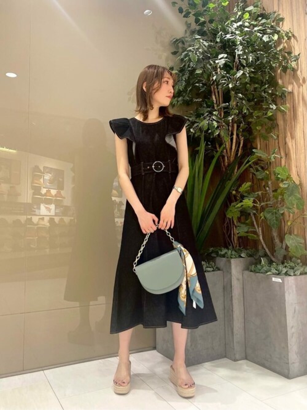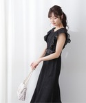 162cm / 骨格ナチュラル / ブルベ冬 【着用サイズ 】ワンピース:S 【普段サイズ 】ワンピース:S 大きめのラッフルデザインが肩まわりを華奢みせしてくれます♡ 切り替え位置が高くウエストベルトを絞ることで、さらにスタイルアップ効果も♪ しっかりとしたハリ感のあるデニムですが、重くなく着心地も良い一枚です! 大人っぽいブラックデニムには、カラーバック+スカーフで華やかさを出すことで、さらにお洒落な印象に◎