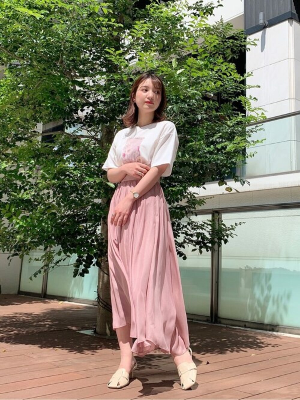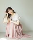 158cm/骨格ストレート/イエベ春 【着用サイズ】トップス:FR スカート:M 【普段サイズ】トップス:S スカート:S 《トップス》 大きなお花のフォトプリントが可愛らしいTシャツです♡ オーバーシルエットすぎないTシャツなので女性らしい印象になります◎ デニムやカラーパンツでカジュアルに着ていただいても◎ もちろんフレアスカートでフェミニンな着こなしもとても可愛いです♡ 《スカート》 キラキラで可愛いフレアスカート♡ トレンドのシアー素材&ラメ入りなので光に当たると、とても綺麗です! シルエットは裾のセンター部分が短くなっており足長効果も抜群◎ 広がりすぎないフレアスカートはボリュームのあるトップスや、大きめのTシャツにも相性抜群です!