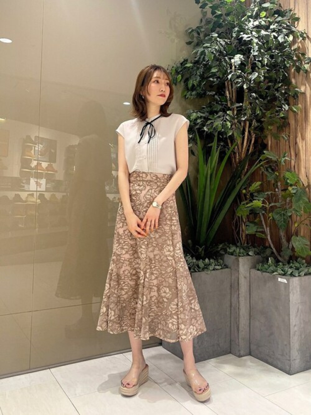 162cm / 骨格ナチュラル / ブルベ冬 【着用サイズ 】ブラウス:M スカート:S 【普段サイズ 】トップス:S ボトムス:S 《ブラウス》 真夏日も涼しく着れること間違いなし◎ フレンチスリーブのお袖が二の腕を程よくカバーしてくれます♡ 肌馴染みの良いベージュはカラーアイテムはもちろん、ワントーンコーデにも着回しやすい一枚です♪ 《スカート》 ニュアンスカラーとマーメイドラインが上品で大人っぽいスカートです! 程よい透け感のある素材なので、どんなトップスと合わせてもコーデに抜け感が出ます♪ ウエストの後ろにゴムが施されているので、シルエットもタイト過ぎず着心地◎