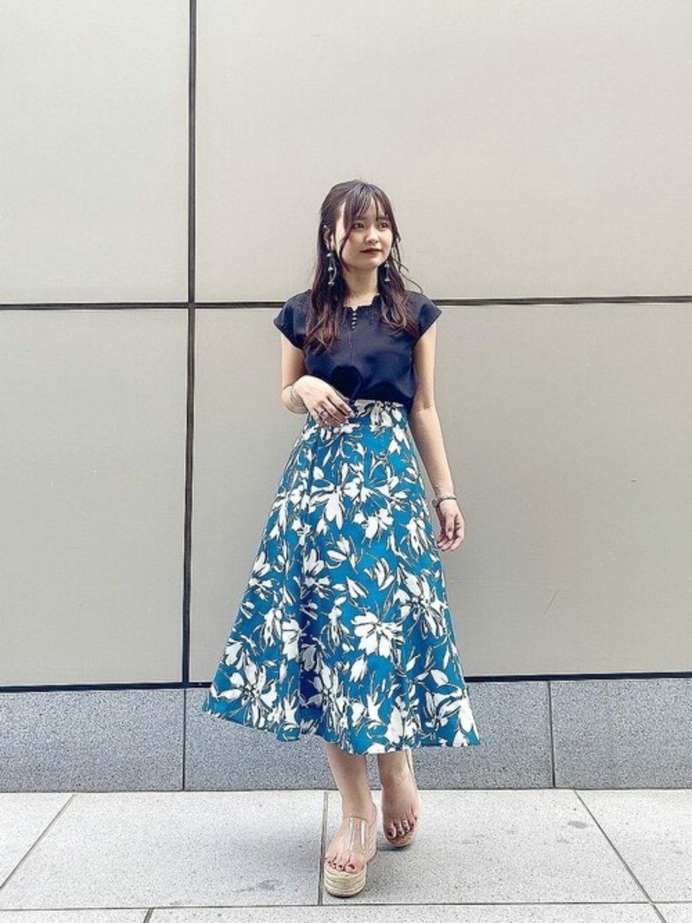 身長:155cm / 骨格:ウェーブ 【着用サイズ】トップス:FR、スカート:M 【普段サイズ】トップス:S、スカート:S 〈ブラウス〉 胸元のカットワークが程よい肌見せで女性らしいブラウスです! さらっとした素材は着心地も良く、暑い夏にもピッタリ◎ 着用のブラックは一枚あると着回しできること間違いなしです♡ フレンチスリーブは二の腕もさりげなくカバーしてくれるので、オンオフ共に使いやすいデザインです♪ 〈スカート〉 プロポーションオリジナルの甘くなりすぎない大きめな花柄が大人っぽく、着用のグリーンは華やかな印象になります♡ サラッとした素材も夏にぴったりで、ウエストの後ろはゴム仕様なので着心地も楽ちんです◎ 着丈が長すぎないので、低身長さんもすっきりとお召しいただけます♪
