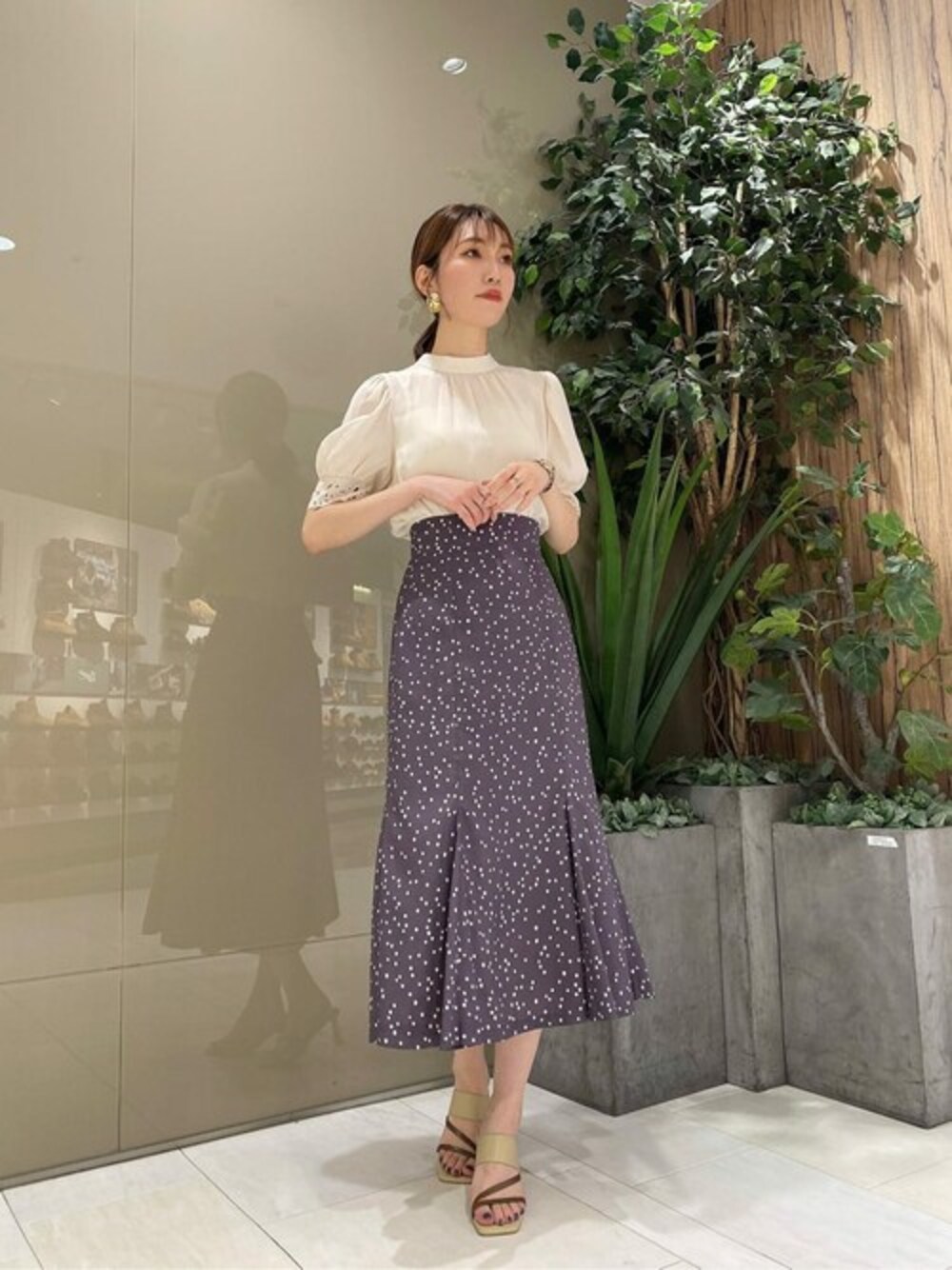 162cm / 骨格ナチュラル / ブルベ冬 【着用サイズ 】ブラウス:FR スカート:S 【普段サイズ 】トップス:S ボトムス:S 《ブラウス》 お袖に刺繍レースや、今年らしいタックが入っていてシンプルなデザインの中にも可愛いらしさが詰まった一枚です! 広がり過ぎないパフスリーブが二の腕を華奢に見せてくれます♡ 首元は詰まりすぎていないプチハイネックなので、お顔周りもスッキリした印象に♪ エクリュ色はモカブラウンのスカートとも相性がよく、秋冬に増えてくるくすみカラーとも合わせやすいお色味です◎ 《スカート》 素材感は軽く涼しげなので、身軽に着用していただけます♪ ウエスト周りのスッキリしたデザインと程よいハイウエストシルエットで脚長効果も♡ バックスタイルにゴムが施されているので、フィット感も強くないマーメイドスカートです。 ランダムドットも小さめなので、カジュアル過ぎずキレイめにも◎ 深みのあるモカブラウン色は秋までお使いいただけます!