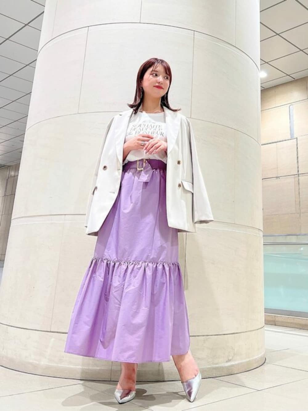 158cm/骨格ストレート/イエベ春 【着用サイズ】トップス:FR スカート:M ジャケット:S 【普段サイズ】トップス:S スカート:S 【Tシャツ】 大人っぽいロゴがポイントのTシャツ♩ 大きすぎないシルエットがカジュアルになりすぎず、お召し頂けます♡ 【スカート】 デザインが可愛いティアードスカート♡ 張り感のある素材で、ふんわりと綺麗なシルエットがでます♩ ウエストはゴムになっているので、楽にお召し頂けます♡ 秋になると、ブーツを合わせていただいても可愛いスタイリングだと思います♪