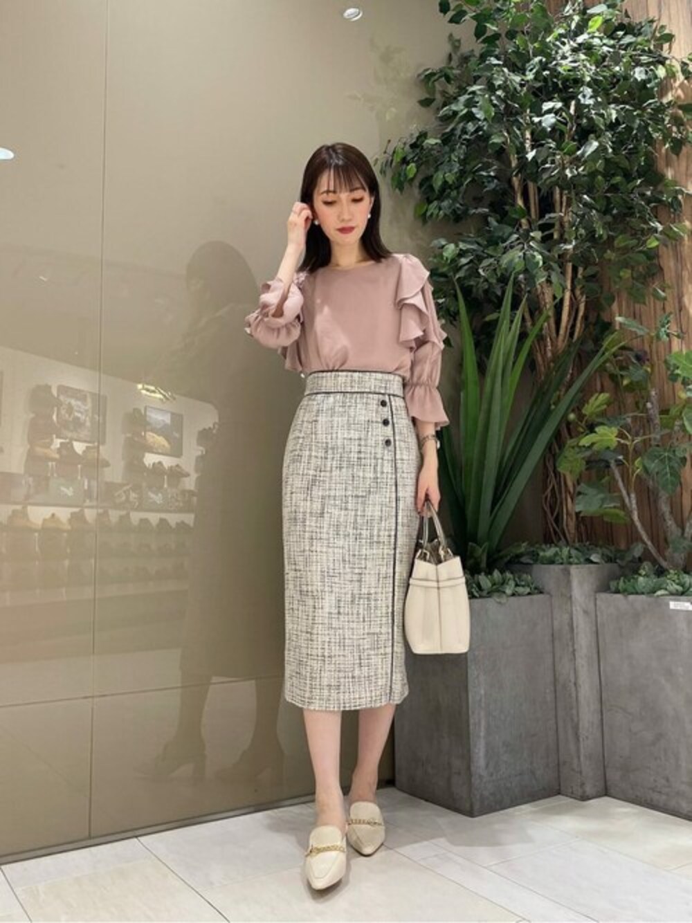 162cm / 骨格ナチュラル / ブルベ冬 【着用サイズ 】ブラウス:M スカート:S 【普段サイズ 】トップス:S ボトムス:S 《ブラウス》 サラっとした肌触りが、秋まで着心地の良いブラウスです! 襟ぐりは程よく開いているので、顔まわりもスッキリとした大人な印象に♡ お袖にたっぷり施されたフリルデザインが一枚で着映えするので、ツイード×ラッフル合わせなら程よく甘さのあるトレンドコーデに◎ 大人可愛いピンクは、ON/OFFで使い分けのできる万能カラーです! 《スカート》 高見えするツイード素材は、クラシカルムードを高めてくれる秋冬マストのトレンドアイテムです♡ タイトシルエットは大人っぽさもあり、ON/OFFどちらにもお使いいただけます♪ 太めのウエストマークでメリハリが効き、スタイルアップ効果にも◎ ツイードですが生地も厚すぎない為、ブラウスからニットまで幅広いトップスと組み合わせていただけます!