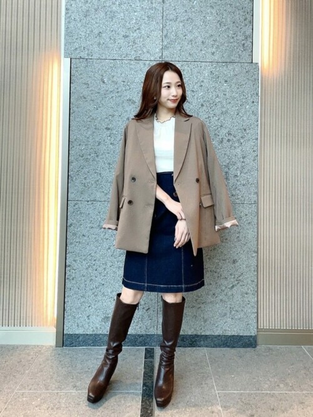 153㎝/骨格ウェーブ/イエベ 【普段サイズ】XS~S 【着用サイズ】トップス/ジャケット:S スカート:XS 今年のトレンドをたっぷり詰め込んだ秋口コーデです。 流行りのミニ丈スカートもプロポならではの短すぎない着丈で抵抗感なく着て頂けます♪ ジャケットとロングブーツはブラウンで統一して、まとまりのあるお出かけコーデにしました◎ 《サイズ感》 デニムミニは小柄さんにも嬉しいXS展開。 ハイウエストで伸縮性があるため、ウエストラインがぴったりフィットします◎ 着丈は153センチで膝上と短すぎず安心して着て頂けます! ジャケットはオーバーサイズなのでジャストサイズでの着用がおすすめです。