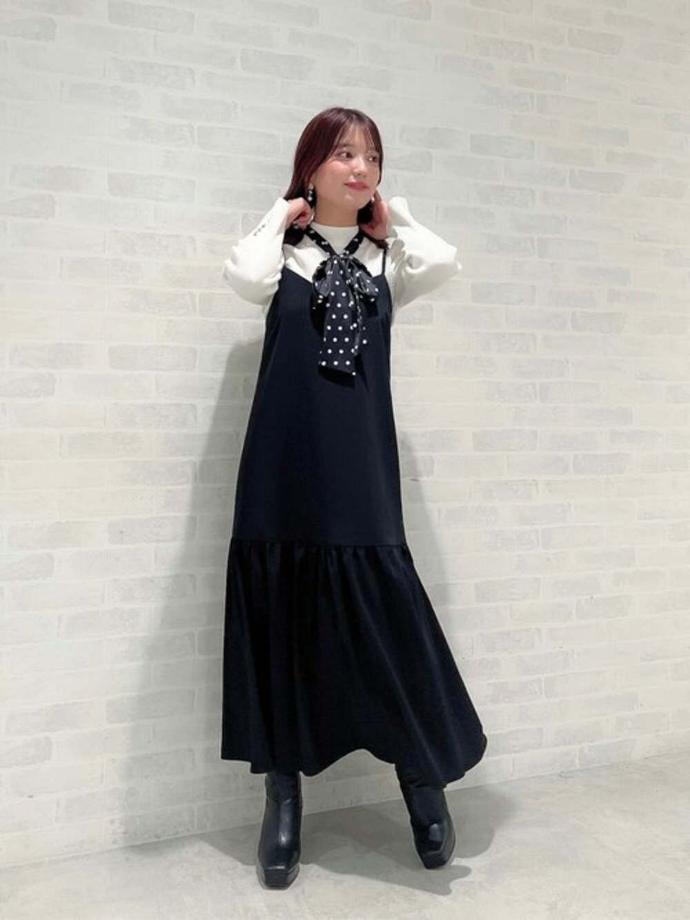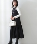 158cm/骨格ストレート/イエベ春 【着用サイズ】トップス:M ワンピース:M 【普段サイズ】トップス:S ワンピース:S 《ニット》 ドットリボンが可愛いニット♡ 大きめのドットなので可愛い雰囲気を演出してくれます♡ 肩の部分がボリュームがあり今年らしいデザインになっています! お袖のゴールドボタンもさりげなく可愛いポイント♩ 《ワンピース》 着回しがきくジャンパースカート♡ インナーを変えるだけで雰囲気を変えられます! 程よいティアードデザインなので、幼くなりすぎずお召し頂けます♡