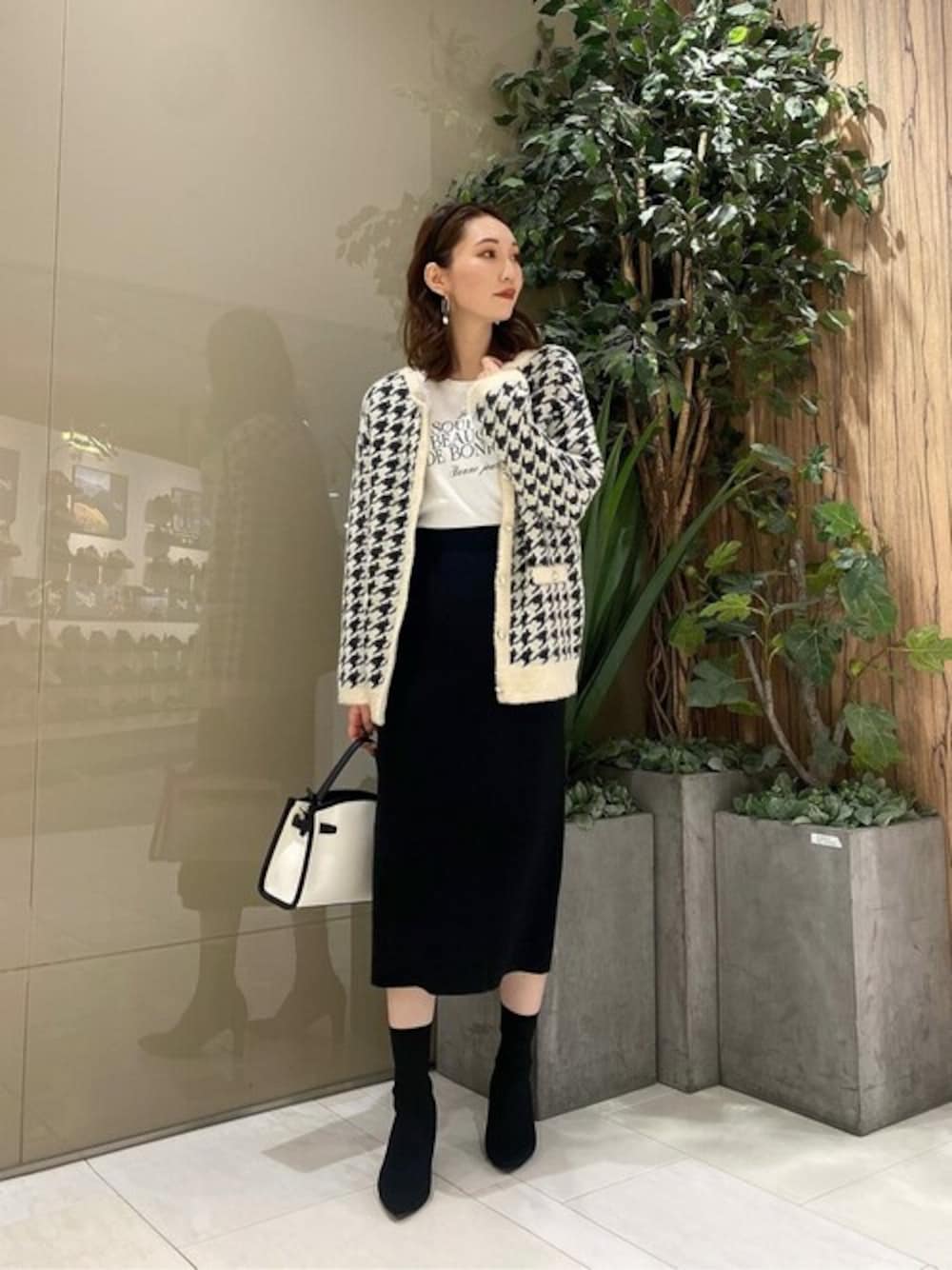 162cm / 骨格ナチュラル / ブルベ冬 【着用サイズ 】カットソー:FR カーデ:M セットアップ:M 【普段サイズ 】カットソー:S カーデ:S セットアップ:S セットアップのスカートを使った着回しコーデ♡ ハイゲージのタイトスカートなので、ヒップラインを強調せず、リラックス感のある着心地が嬉しい一枚。 シンプルなニットスカートなので、カジュアルなロゴTやざっくりとしたカーデ合わせにすることで、大人っぽさのあるクールな着こなしも叶います♪