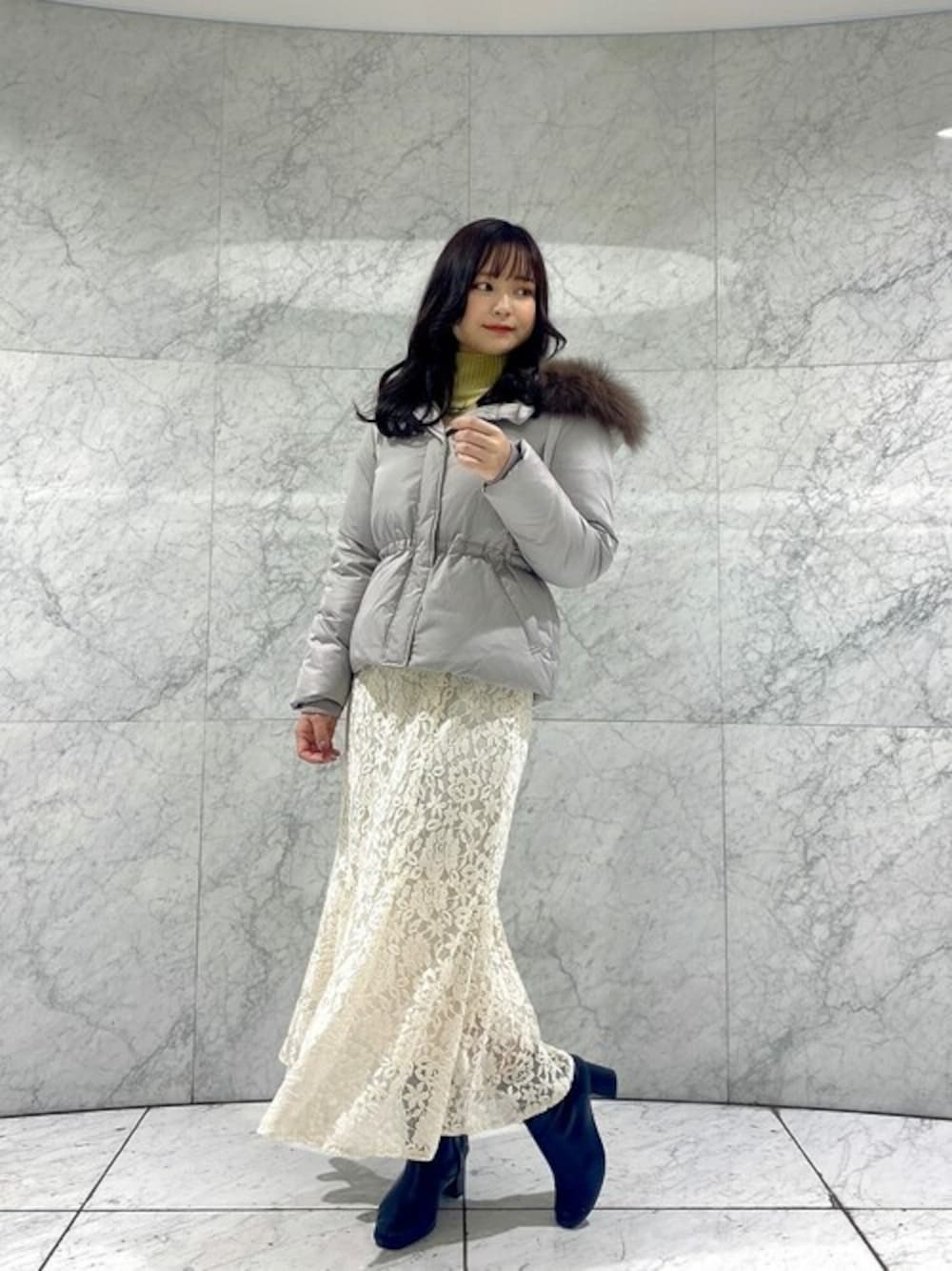 身長:155cm / 骨格:ウェーブ 【着用サイズ】ニット:FR、スカート:M、ダウン:S 【普段サイズ】トップス:S、スカート:S、ダウン:S 〈ニット〉 ふわふわで柔らかいフォックス混のニットです! 裾にサイドスリットが入っているので抜け感がありおしゃれ見えし、前だけインをしていただくとこなれた印象でお召しいただけます♪ ベーシックなデザインで着まわし力も抜群です◎ 〈スカート〉 モールレースが少し起毛感があり、冬にぴったりのレースマーメイドスカートです! 歩くと裾が揺れ、女性らしい印象に♡ 裏地が少し短くなっているので、足首がすっきりと見え、小柄な方でもバランス良くお召しいただけます! ウエストの後ろにゴムが入っているので、楽に着用していただるのも嬉しいポイント♪ 〈ダウン〉 ウエストマークが調整できるデザインなので、着膨れしがちなダウンもすっきりとメリハリのあるシルエットでお召しいただけます♪ お顔まわりを華やかに見せてくれるファーは取り外し可能なので、シーンに合わせて着用できます◎ すっきりとしたシルエットですが、見頃や袖は少しゆとりがあり、厚手なトップスでも合わせていただけます!