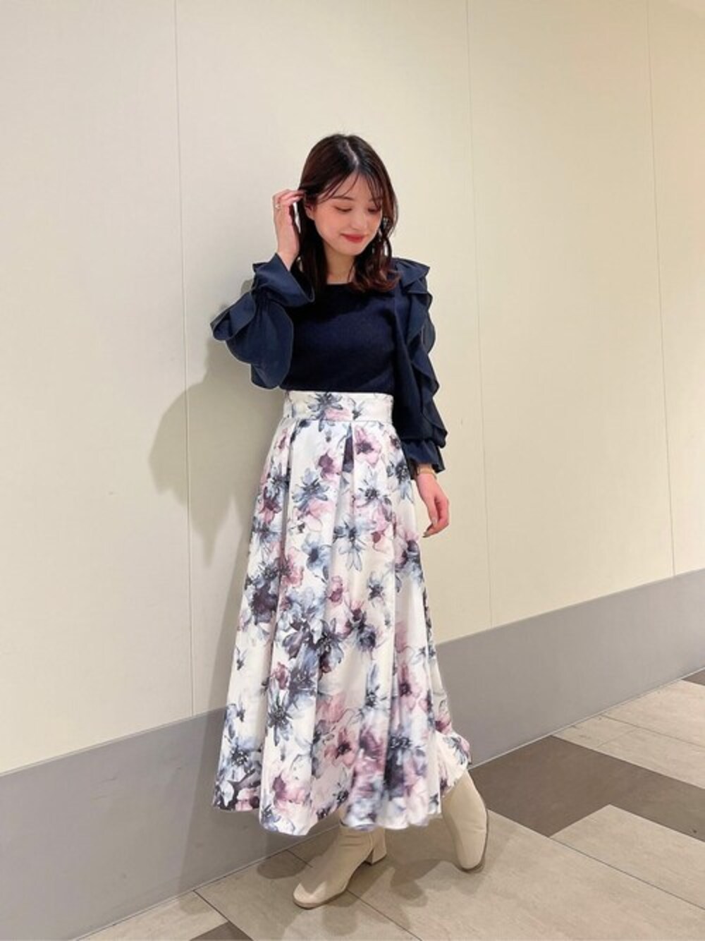 158cm/骨格ストレート/イエベ春 【着用サイズ】ニット:FR スカート:M 【普段サイズ】ニット:S スカート:S 《ニット》 お袖のフリルスリーブが華やかで着映え間違いなしのニットプルオーバーです。 袖はブラウス素材ですがほんのり透ける程度なのでインナー着用しても目立ちにくいです♡ 見頃はリブ編みなのでインスタイルもスッキリまとまります♡ 《スカート》 大きなフラワー柄が印象的なタックフラワースカートです♡ 水彩画タッチなので大柄でも柔らかく優しい印象でお召し頂けます! タックがしっかり入っているのでふんわり広がるシルエットで一気に女性らしくなれる一枚です♡