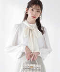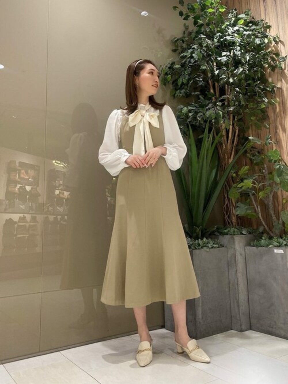 162cm / 骨格ナチュラル / ブルベ冬 【着用サイズ 】ブラウス:M ジャンスカ:M 【普段サイズ 】トップス:S ワンピース:S 《ブラウス》 バイカラー風の配色で立体感のある大きなボウタイデザインが顔まわりを華やかに見せてくれます♡ ふんわりとしたボリュームスリーブはさりげない透け感があるので、きちんと感も備えつつコーデに抜け感を出してくれます。 インナーとしても重ね着しやすいデザインなので、ジャンスカ合わせも相性の良い一枚です◎ 《ジャンスカ》 体に程よくフィットするマーメイドシルエットが着痩せして見えるジャンスカです♡ 少し厚みのある生地なので今からシーズンレスでも着回しやすく、落ち感もあり体のラインをカバーしてくれます。 肩紐の調整も出来るので小柄なお客様にもおすすめ◎ カジュアルになりがちなジャンスカもブラウス合わせなら綺麗めに仕上がります♪