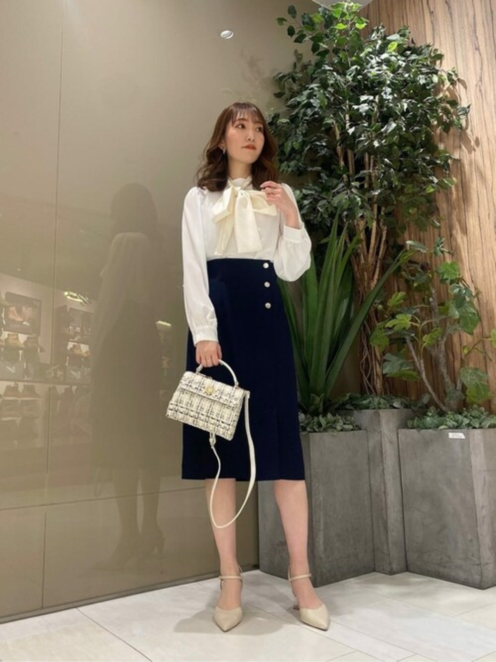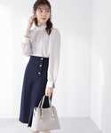 162cm / 骨格ナチュラル / ブルベ冬 【着用サイズ 】ブラウス:M スカート:S 【普段サイズ 】トップス:S ボトムス:S 《ブラウス》 光沢感のある大きめのボウタイリボンは、ブラウスとバイカラー風に見えるデザインがお洒落で、顔周りを華やかに見せてくれます♡ 肩や袖口に程よくギャザーが入っているので、ふんわりとしたボリューム感のあるお袖が可愛らしい印象を与えてくれます。 胸元にもギャザーが入っているのでリボンを外してもシンプル見えせず、さり気ないワンポイントに◎ 《スカート》 サイドのゴールドボタンが上品なツイードスカートです! サラッとして軽やかな春ツイード素材が着心地良く、着丈も長過ぎないので小柄な方にもおすすめ◎ 無地見えするのでシンプルで着回しやすく、通勤コーデにもピッタリの一枚。 ウエスト周りをすっきりと見せてくれるデザインで、細見え効果も期待できます♡