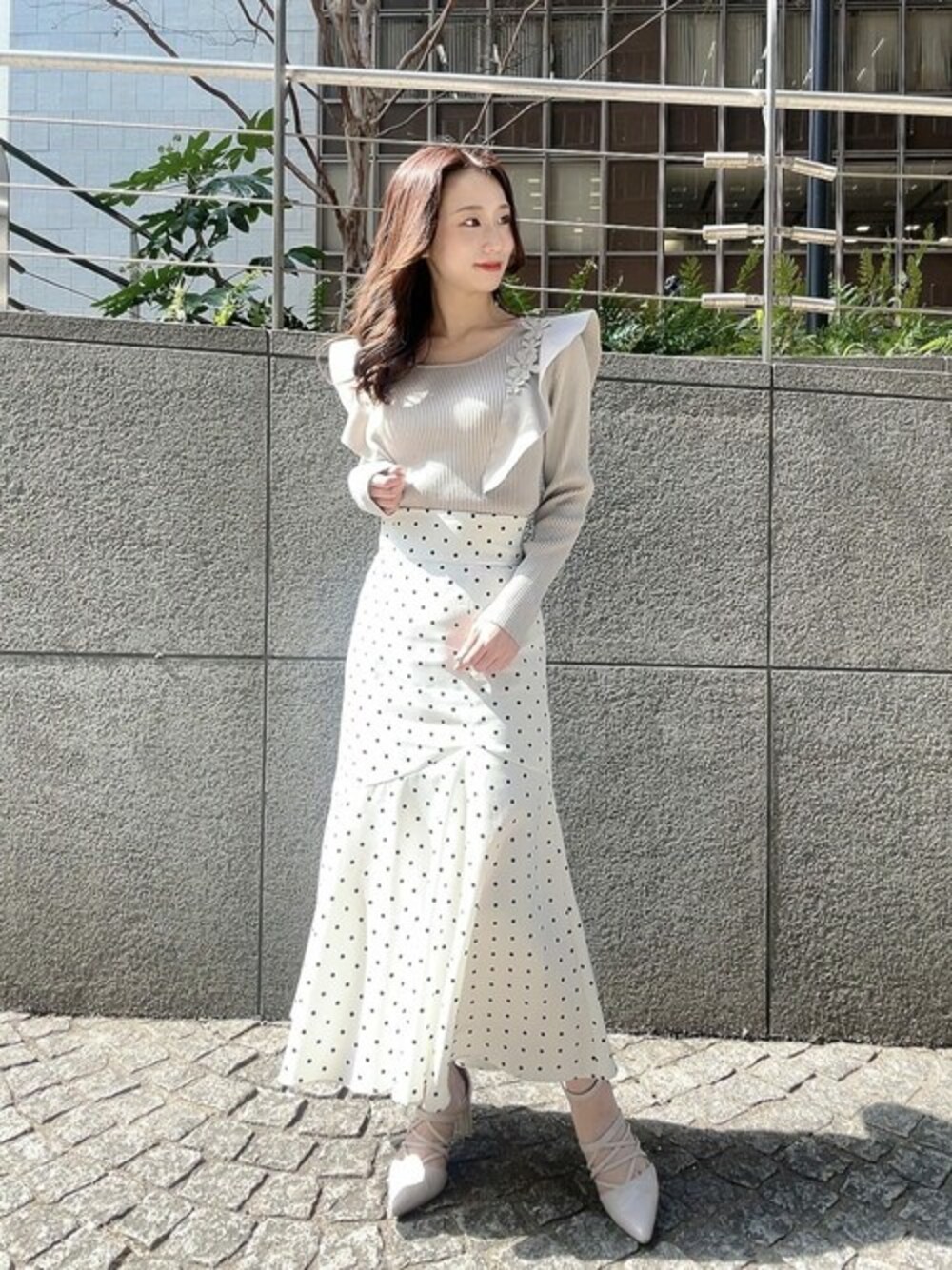 ig:proportionbodydressing ♡ STAFF身長:153㎝ 【着用サイズ】ニット:M スカート:XS 【普段サイズ】XS、S、PS <ニット> 肩のラッフルとポイント使いのフラワーレースが主役級の華やかさを魅せてくれる1枚◎ プロポーションらしいニュアンスカラーは、今年トレンドのグリーンがオススメです♡ デコルテが華やか見えする為骨格ウェーブの方はもちろん、鎖骨ラインが綺麗に出るのでストレートさんも挑戦しやすいアイテムです◎ <スカート> 店舗大人気のアシメドットスカートは、高めの切り替えで脚長効果もバツグンな1枚◎ 小柄な方にも嬉しいXSサイズがございます! 画像のようなトップスインコーデも綺麗に着こなせますが、ショート丈ニットやパーカーと合わせてカジュアルな着こなしも叶う、着回し力バッチリなアイテムです◎ 身長153cmでXSサイズ着用、着丈はくるぶし上となっておりトレンド感のあるロング丈です♡