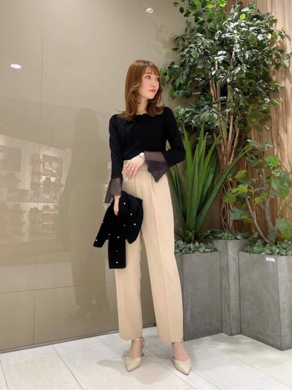 ig:proportionbodydressing ♡ STAFF身長:162cm / 骨格ナチュラル / ブルベ冬 【着用サイズ 】カットソー:FR カーデ:M パンツ:S 【普段サイズ 】トップス:S ボトムス:S 《トップス》 スカラップデザインとドットの刺繍が可愛らしいカーディガンです♡ 少し短めの丈感は合わせるボトムを選ばずにお使い頂けます◎ インナーは袖口のシアー素材が手元を華やかに見せてくれるカットソー。 程よいパフスリーブなのでインナーとしてはもちろん、一枚で着用してもかわいいです! 《パンツ》 脚をすっきりと細長いシルエットに見せてくれるテーパードパンツです! ウエストの後ろ部分がゴムなので着心地がよく動きやすいのも嬉しいポイント◎ トップスをインして着るとゴールドプレートが見えて、より上品な印象を与えてくれます♡