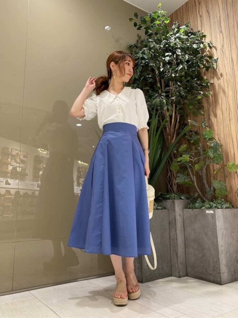 ig:proportionbodydressing ♡ STAFF身長:162cm / 骨格ナチュラル / ブルベ冬 【着用サイズ 】ブラウス:M スカート:S 【普段サイズ 】トップス:S ボトムス:S 《ブラウス》 プロポーションオリジナルの花柄の刺繍があしらわれた襟は、上品で華やかな印象を与えてくれます♡ すっきりとしたVネックで大人っぽさもプラス。 ふんわりとしたお袖で二の腕カバーをしつつ、袖口のシャーリングですっきり細見せもしてくれます◎ 《スカート》 程よいハリ感があり、サラッとした肌触りのスカートです! 大きめのタックが入っていて生地もふんだんに使っているので、ふんわりとした華やかなフレアラインに仕上げてくれます♡ 後ろにはゴムが入っているので着心地も抜群です◎