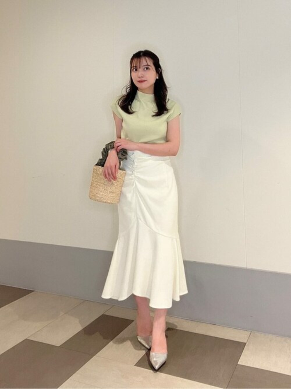 ig:proportionbodydressing ♡ STAFF身長:158cm/骨格ストレート/イエベ春 【着用サイズ】ニット:M スカート:M 【普段サイズ】ニット:S スカート:S 《ニット》 一枚あると万能なニット♡ 顔映りを明るく見せてくれるピスタチオカラーはコーディネートのアクセントにもなります♩ 肩が少し隠れる袖丈なので、華奢に見せてくれます! 《スカート》 アシンメトリーのギャザーとタックで仕上げているので、フィット&フレアのシルエットがキレイな女性らしいマーメイドスカートです♡ サイドにパールが付いているので、今年らしく上品にお召し頂けます♡ ツイードライクなキラッとした素材で、身につけるだけでパッと華やかに見せてくれます♡