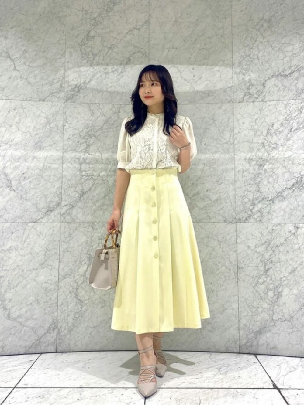 ig:proportionbodydressing ♡ 身長:155cm / 骨格:ウェーブ 【着用サイズ】ブラウス:M、スカート:M 【普段サイズ】トップス:S、スカート:S 〈ブラウス〉 襟ぐりのフリルとフロントのレースが華やかなブラウスです! 程よく光沢感のある素材とレースの組み合わせは、上品な女性らしさを演出してくれます♡ パフスリーブで気になる二の腕をカバーしてくれるのも嬉しいポイント◎ 〈スカート〉 フロントのボタンがアクセントなフレアスカートです! ウエストのタックが腰まわりをキュッとすっきり見せてくれます♪ 着丈が長すぎないので、小柄な方もバランス良くお召しいただけます!
