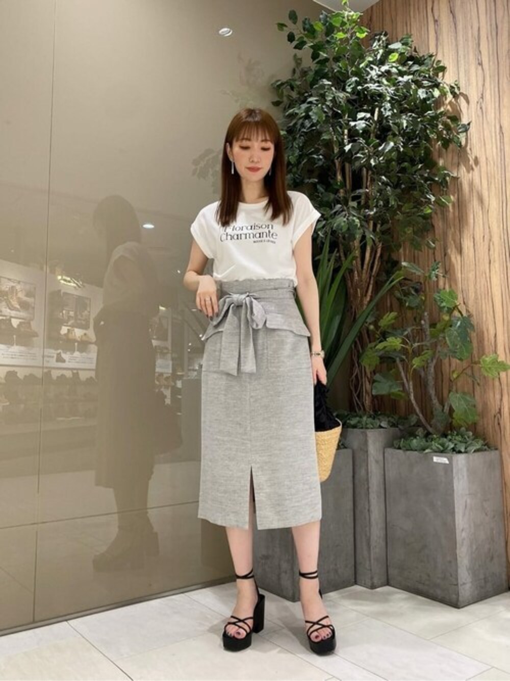 ig:proportionbodydressing ♡ STAFF身長:162cm / 骨格ナチュラル / ブルベ冬 【着用サイズ 】Tシャツ:FR スカート:M 【普段サイズ 】トップス:S ボトムス:S 《Tシャツ》 一枚あれば真夏日も安心♡ シンプルなモノトーンの配色や丸みのあるロゴデザインが抜け感を演出してくれます。 程よく肩まわりをカバーしてくれるリラックス感のあるデザインなので、スカート合わせならフェミニンカジュアルな着こなしを叶えてくれます♪ 《スカート》 清涼感のある麻調素材が夏にぴったりのタイトスカート♡ 大きめのポケットデザインやリボンがワンポイントになるので、シンプルなトップスとも相性◎ 軽くてシワにもなりづらいポリエステル素材なので通勤スタイルにもおすすめの一枚です!