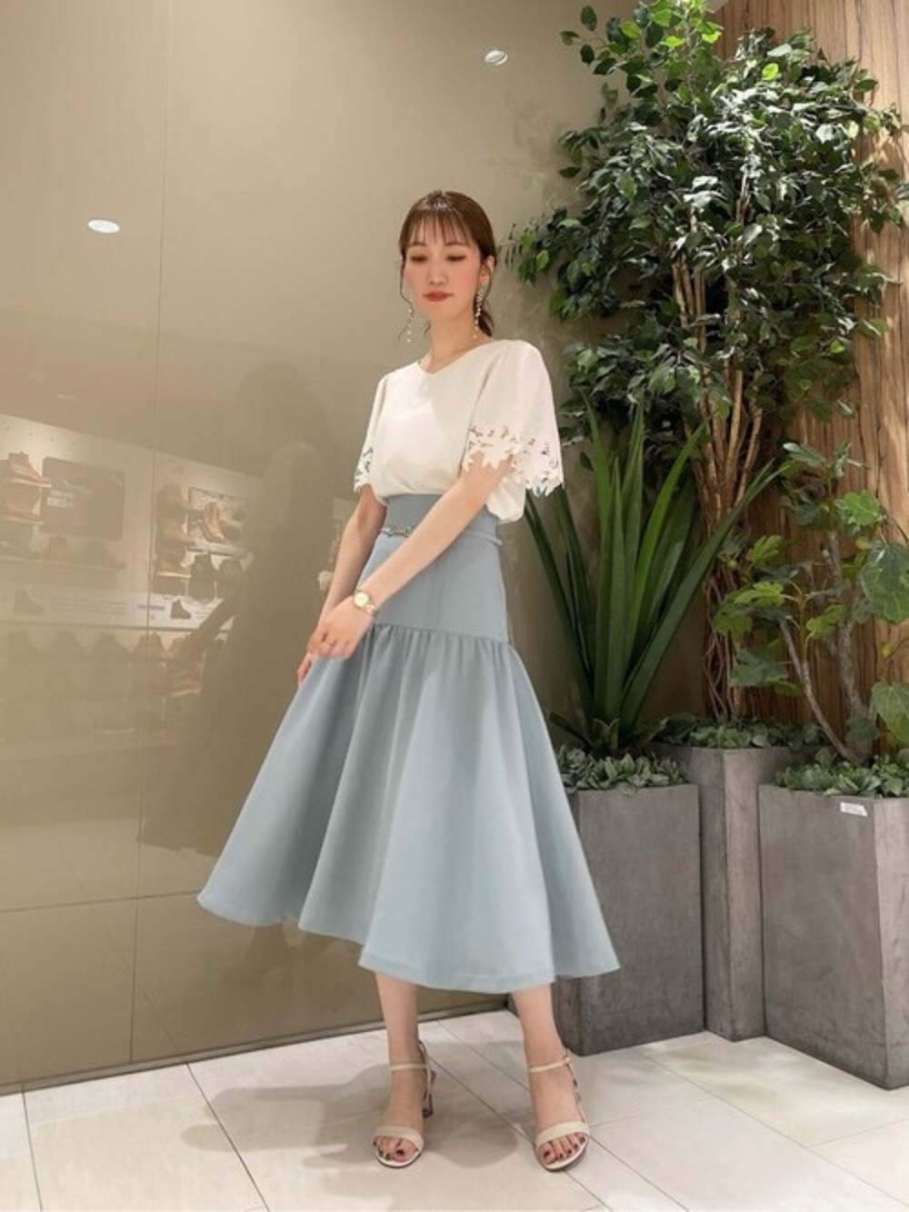 ig:proportionbodydressing ♡ STAFF身長:162cm / 骨格ナチュラル / ブルベ冬 【着用サイズ 】ブラウス:M スカート:S 【普段サイズ 】トップス:S ボトムス:S 《ブラウス》 お袖のカットワークレースがワンポイントで高見えします♡ 二の腕カバーもしてくれるので、オンオフ兼用でシーンを選ばず着回しやすいブラウスです。 体のラインを拾いすぎないゆったりとしたシルエットなので、真夏日でも涼しくご着用いただけます。 《スカート》 ふんわり広がるフレアシルエットと爽やかな色味が夏らしいスカートです! ウエストマークのベルトがワンポイントとなり腰まわりをすっきり見せてくれます! 軽やかで清涼感のある生地なので、今から長いシーズンで、オンオフ兼用の着回しが可能です◎