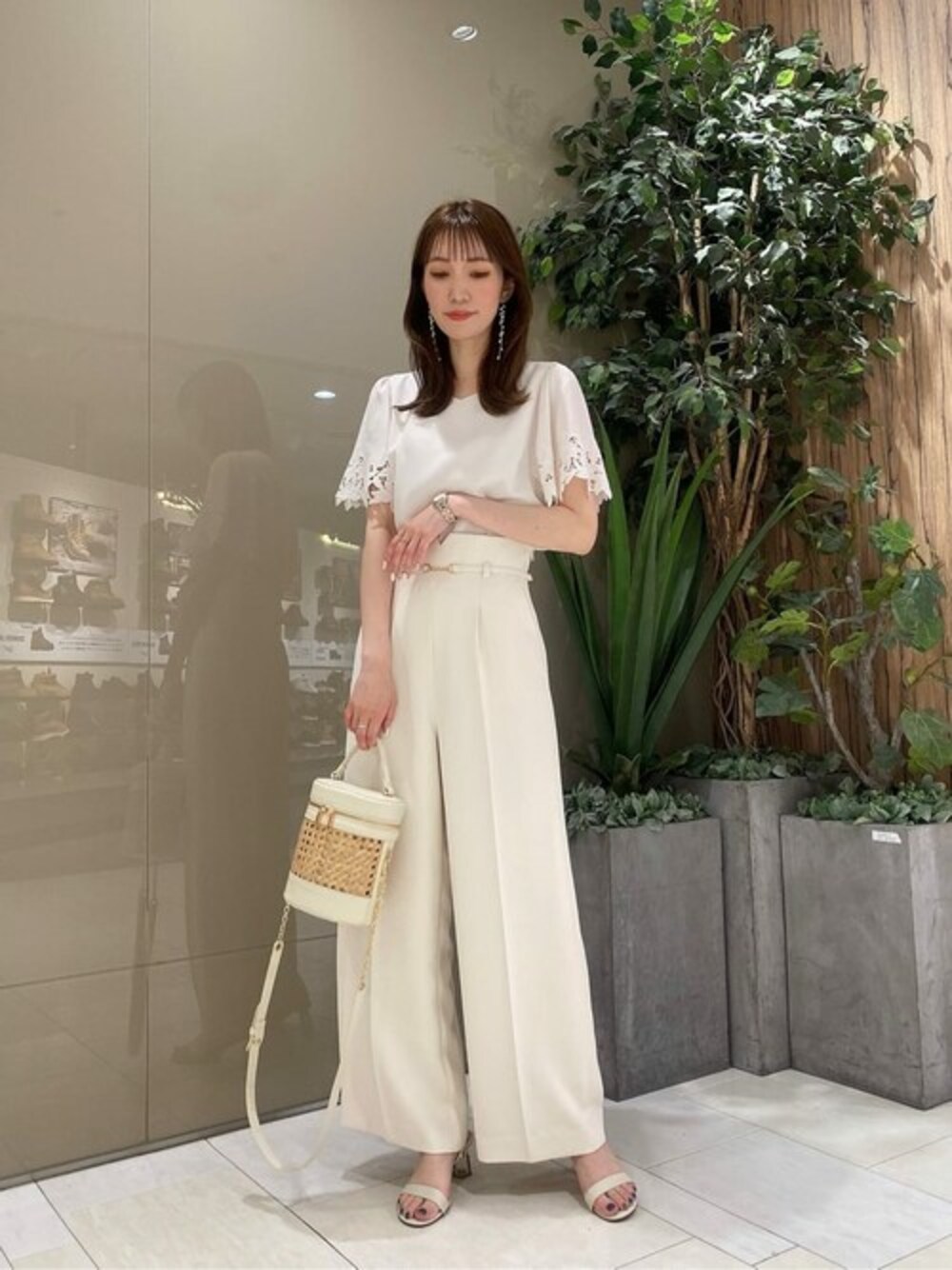 ig:proportionbodydressing ♡ STAFF身長:162cm / 骨格ナチュラル / ブルベ冬 【着用サイズ 】ブラウス:M パンツ:M 【普段サイズ 】トップス:S ボトムス:S 《ブラウス》 お袖のカットワークレースがワンポイントで高見えします♡ 二の腕カバーもしてくれるので、オンオフ兼用でシーンを選ばず着回しやすいブラウスです。 体のラインを拾いすぎないゆったりとしたシルエットなので、真夏日でも涼しくご着用いただけます。 《パンツ》 さらっとした軽やか素材が涼しげな夏にぴったりなパンツです! ハイウエストとセンタープレスデザインなので、履くだけで脚長効果抜群の一枚◎ トップスをインスタイルにすることで、ウエストのVカットやチェーンベルトがコーデのワンポイントが映えるさりげないオシャレ見えのデザインです♡