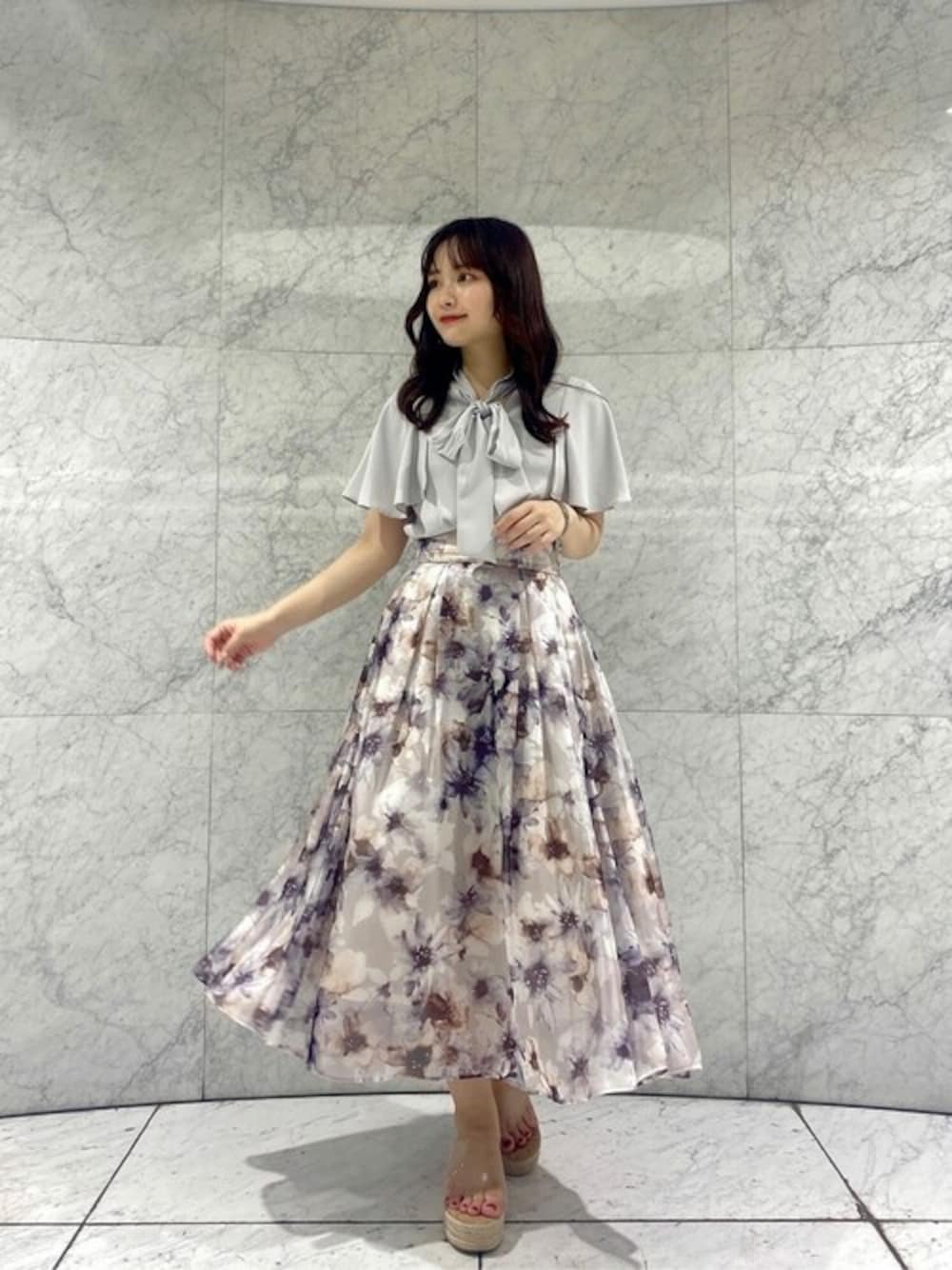 ig:proportionbodydressing ♡ STAFF身長:155cm / 骨格:ウェーブ 【着用サイズ】ブラウス:S、スカート:S 【普段サイズ】トップス:S、スカート:S 〈ブラウス〉 マルチウェイで使えるので、着まわし力抜群の一枚です! フレアスリーブが二の腕をしっかり隠してくれるのが嬉しいポイントです♪ サラッと軽く涼しげな素材なので、今からの時期にぴったりです◎ 〈スカート〉 花柄がパッと目を惹く主役級のスカートです♪ 柔らかいカラーの花柄なので、派手になりすぎず柄もの初心者さんも挑戦しやすいアイテムです! ツヤっとした光沢と、とろみのある素材は上品な印象で、高見えしてくれます! 後ろにはゴムが入っているので、楽にお召しいただけるもの嬉しいポイント◎