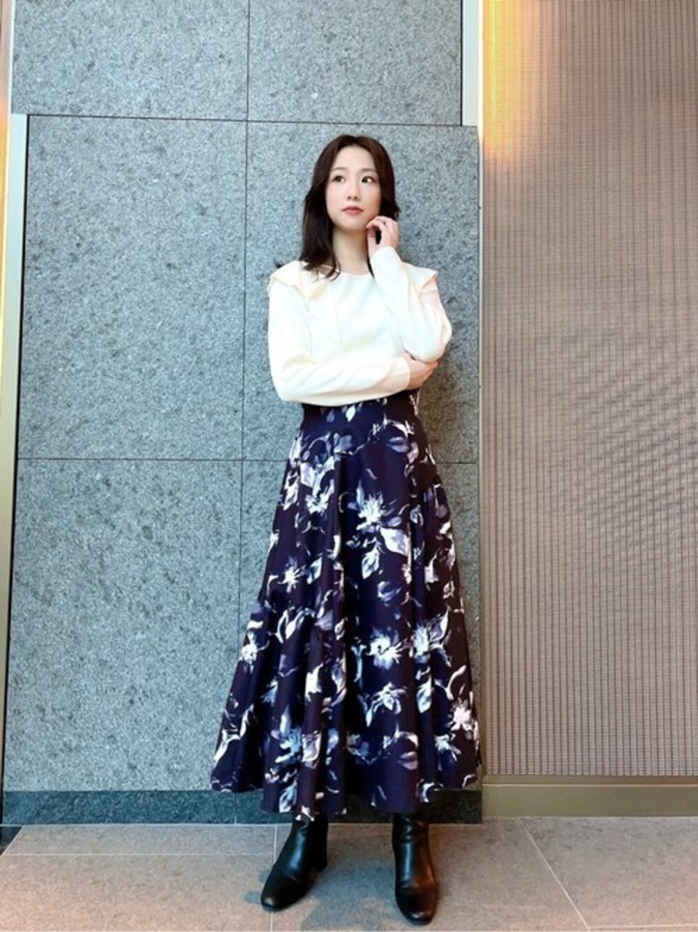 ig:proportionbodydressing ♡ STAFF身長:153㎝ 【普段サイズ】XS、S、PS 【着用サイズ】M <ニット> トレンドのラリエットとデコルテのラッフルデザインが女性らしさ漂う1枚です♡ 柄物から無地アイテムまで、ボトムスを選ばずに着回しができる優秀アイテムです◎ <スカート> 存在感のあるぼかしフラワーが目を引く、トレンドスカートです◎ 柔らかいバックゴム仕様になっており、ウエスト周りもストレスフリーに着ていただけます。 身長153cmでMサイズを着用しており、着丈は足首上となっています。