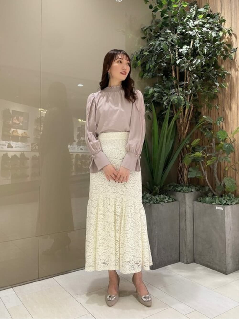 ig:proportionbodydressing ♡ STAFF身長:162cm 【着用サイズ 】ブラウス:M スカート:M 【普段サイズ 】トップス:S ボトムス:S 《ブラウス》 微光沢のやわらかい風合いがフェミニンで女性らしい♡ お袖に施されたシャーリングも表情感があるので、横からのシルエットも可愛さがあり、シンプルなアイテムに取り入れるだけで華やかさもUPします! さりげないデザインアイテムなので、通勤やデイリーにも取り入れやすいです◎ 《スカート》 起毛感のあるモールレースが秋冬らしい温かみのある1枚♡ 程よい厚みもあるのでボリュームのあるニットからブラウスまで、幅広いアイテムとの着回しもおすすめです! エクリュの色味はON·OFFともに使いやすく、春までトップスを選ばずにご着用いただけます◎