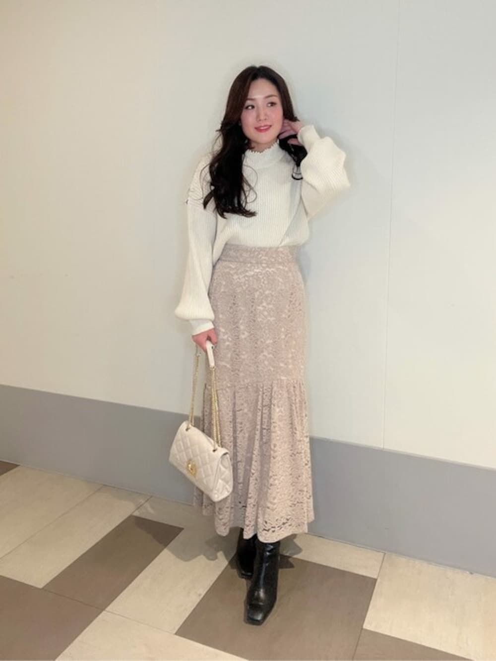 ig:proportionbodydressing ♡ STAFF身長:156cm 【着用サイズ】ニット:FR スカート:M 【普段サイズ】ニット:S スカート:S 《ニット》 プロポーションで大人気のニットが春先まで着られるやわらかいカラー展開で登場しました♡ 暖かみのあるニット素材とデザインはそのままなので冬も愛用出来るアイテムです♡ 襟ぐりのパールが大人可愛く上品な印象を与えてくれます♡ 《スカート》 暗くなりがちな冬でも、コーデを一気に華やかに見せてくれるモールレースのマーメイドスカートです♡ 裏地が表地より少し短くなっているので、ブーツ合わせでも足元重たくならずスッキリお召し頂けるのも魅力的です♡