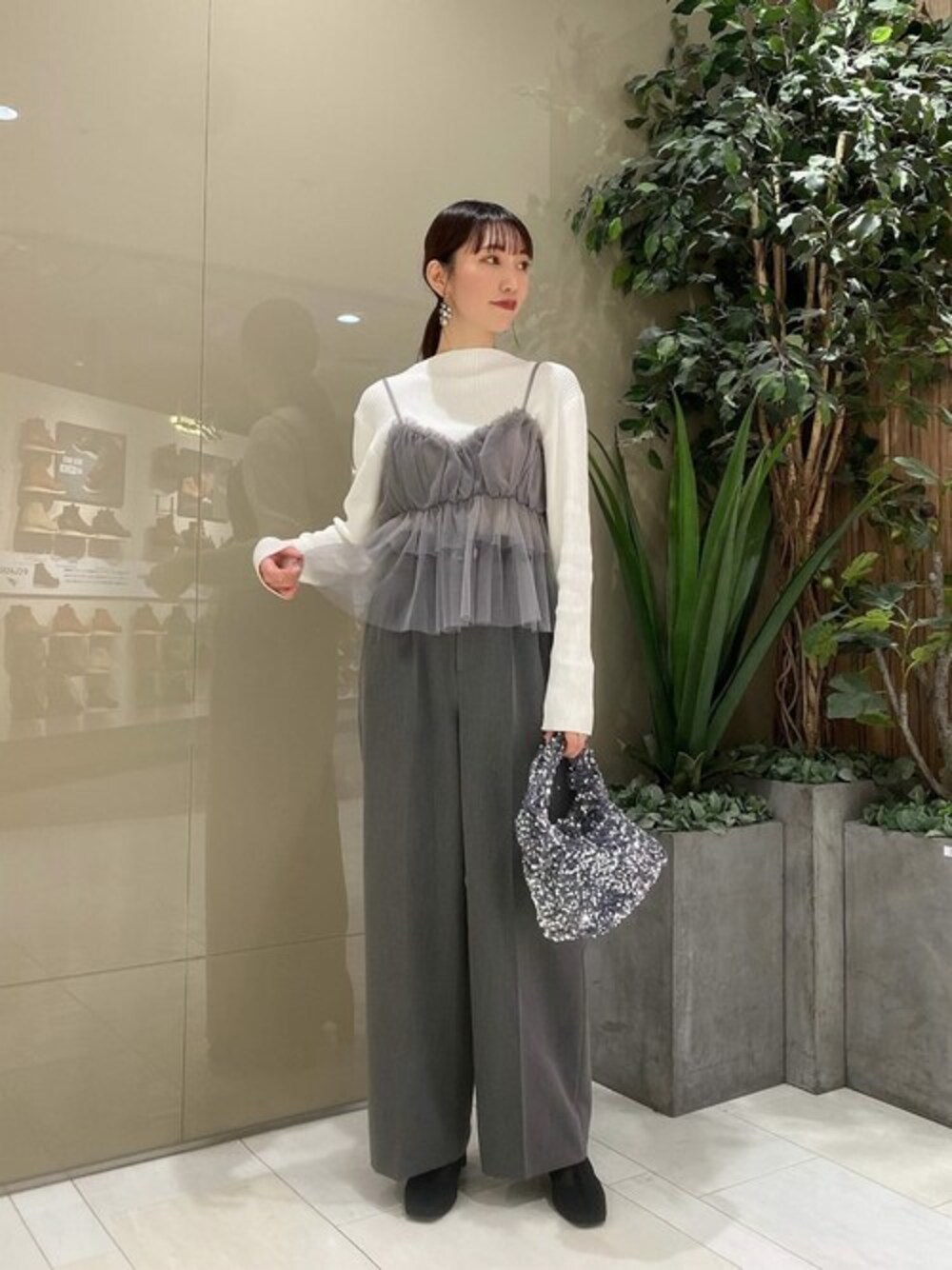 ig:proportionbodydressing ♡ STAFF身長:162cm 【着用サイズ 】ニット:FR パンツ:S 【普段サイズ 】トップス:S ボトムス:S 《ニット》 ふわっとしたチュールのビスチェが今っぽく、一枚でお洒落に決まるトレンドアイテム♡ この時期はニットと合わせることで、今すぐからご着用いただけます! 春先や夏にはインナーをブラウス、カットソー、Tシャツにすることで、シーズンレスでの着回しもおすすめ◎ 《パンツ》 センタープレスが施され、すとんと落ち感のある生地が縦ラインを綺麗に見せてくれます! お洒落に着こなせるグレーの色味はモード感もあり大人っぽさを演出◎ 程よく広がるワイドシルエットなので動きやすく、ON・OFFともに着まわせます。