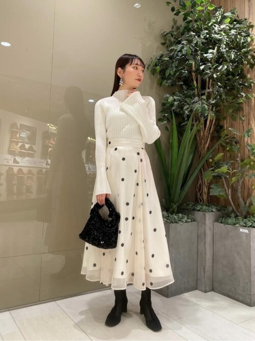 ig:proportionbodydressing ♡ STAFF身長:162cm 【着用サイズ 】ニット:FR スカート:M 【普段サイズ 】トップス:S ボトムス:S 《ニット》 お袖に施されたパールがさりげない甘さを取り入れてくれます♡ 体のラインを拾いすぎず、程よいゆるっとさのあるシルエットなので着心地も良いです。 縦ラインをすっきり見せてくれるリブデザインなので、ウエストインスタイルがおすすめです! 《スカート》 広がりすぎず落ち感のあるオーガンジー素材が高みえし、上品に仕上げてくれるドット柄♡ すっきりとしたウエストラインなので、腰まわりをふんわりカバーし綺麗に見せてくれます! 透けづらい裏地付きなので、エクリュのお色味も安心してご着用いただけます。