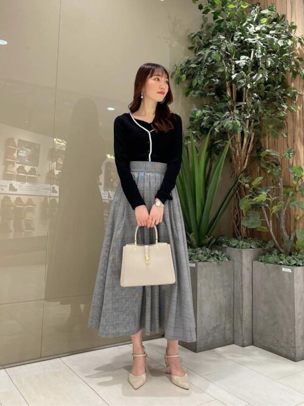 ig:proportionbodydressing ♡ STAFF身長:162cm 【着用サイズ 】ニット:M/スカート:M 【普段サイズ 】トップス:S /ボトムス:S 《ニット》 バイカラーの配色が大人っぽく、全体を引き締めて見せてくれます♡ インナーとカーデはそれぞれ単品でも着回しやすいシルエットに拘った上品な一枚です。 着丈もコンパクトなのでウエストイン・アウト共にすっきりご着用いただけます! 《スカート》 通気性の良いコットンを含んだ、程よいハリ感と広がりが綺麗なスカート♡ 細かいチェック柄なのでフェミニンになりすぎず、トップス次第でカジュアルな着こなしも叶えてくれます。 さりげないモード感のあるブラックは、色味が暗すぎず春夏にも取り入れやすい配色です◎