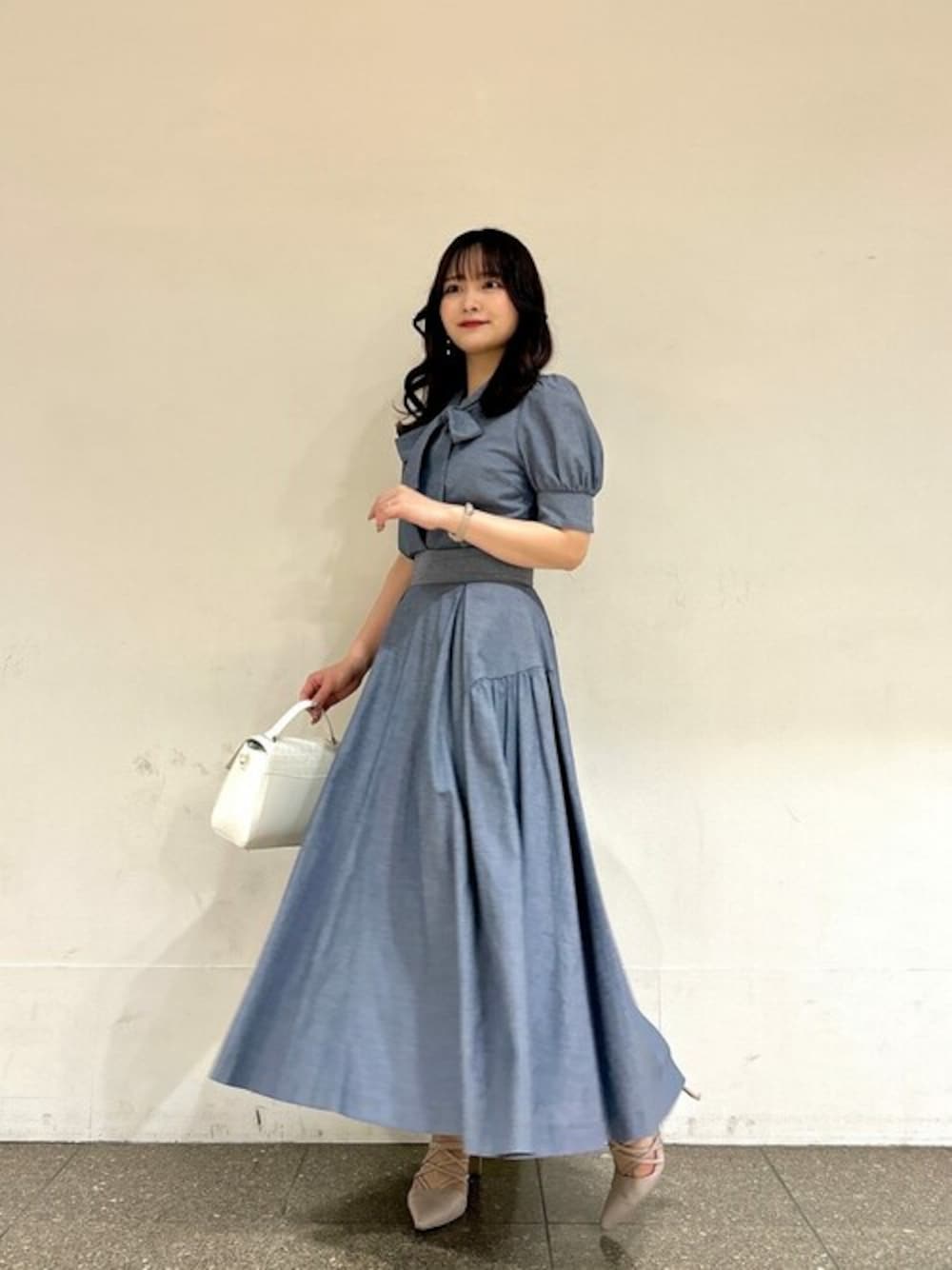 ig:proportionbodydressing ♡ STAFF身長:156cm 【着用サイズ】トップス:M/スカート:M 【普段サイズ】トップス:S/スカート:S 《ブラウス》 デニム見えするシャンブレー素材は通気性が高く、爽やかな印象なので夏にもぴったりな素材です! カジュアルさもありつつ、大きめなボウタイリボンが女性らしさをプラスしてくれます♡ パフスリーブは二の腕をさりげなくカバーし、袖口はスリットが入っているのですっきり見えします♪ 《スカート》 トップスと合わせて着ていただくとワンピース見えし、着映えします♡ タックとギャザーが入っているのでボリューム感があり、ふわっと広がるシルエットが可愛らしい印象になります♪ ウエストベルトが太めになっていて、キュッと締まるデザインなので、スタイルアップが叶います!
