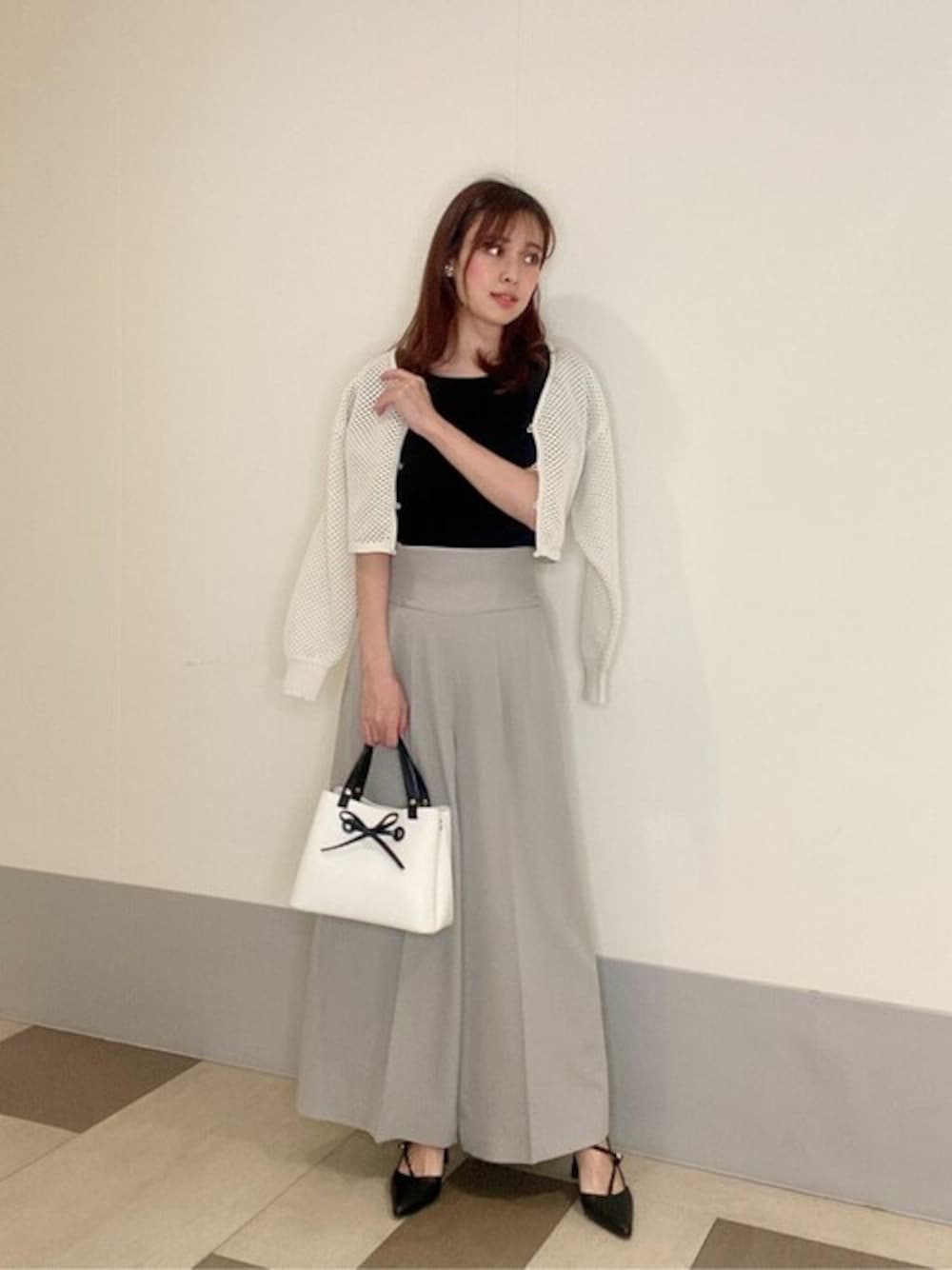 STAFF身長:165cm 【着用サイズ 】ニット:M /パンツ:M /カーデ:FR オフィスにぴったりな、大人シンプルなコーディネート。 ベーシックカラーの組み合わせは日常使いしやすいです◎ 《ニット》 シアーパスデザインがポイント♡ 見頃はすっきり見えするリブニットなので、程よいフィット感が◎ ボトムスにインもしやすく、ジャンスカアイテムのインナーとしてもおすすめです◎ 《パンツ》 動きやすいパンツはお仕事にもお休みにも、持っておきたいアイテム。 シワになりにくい素材で軽く、足に密着しないワイドシルエットが楽ちん♡