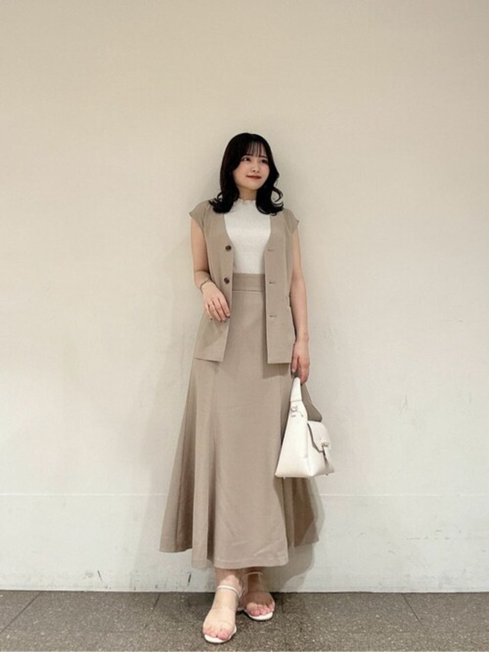 STAFF身長:156cm 【着用サイズ】トップス:M/スカート:M 《ジレ》 さらっと軽い素材なので、夏にもレイヤードスタイルを楽しんでいただけます! 深めのVカットはお顔をシャープにすっきり見せてくれて、着丈は腰まわりをカバーできる長さなのも嬉しいポイント♪ デニムを合わせたカジュアルスタイルもおすすめです! 《ニット》 ラメ糸が入ったシンプルなニットなので着まわし力抜群の一枚です! 程よくフィット感があるので、女性らしさも叶えてくれます! 《スカート》 夏にぴったりなさらっとした素材のスカートです! 裾まわりが綺麗に広がるマーメイドラインのシンプルなスカートなので、オンでもオフでもお使いいただけます♪