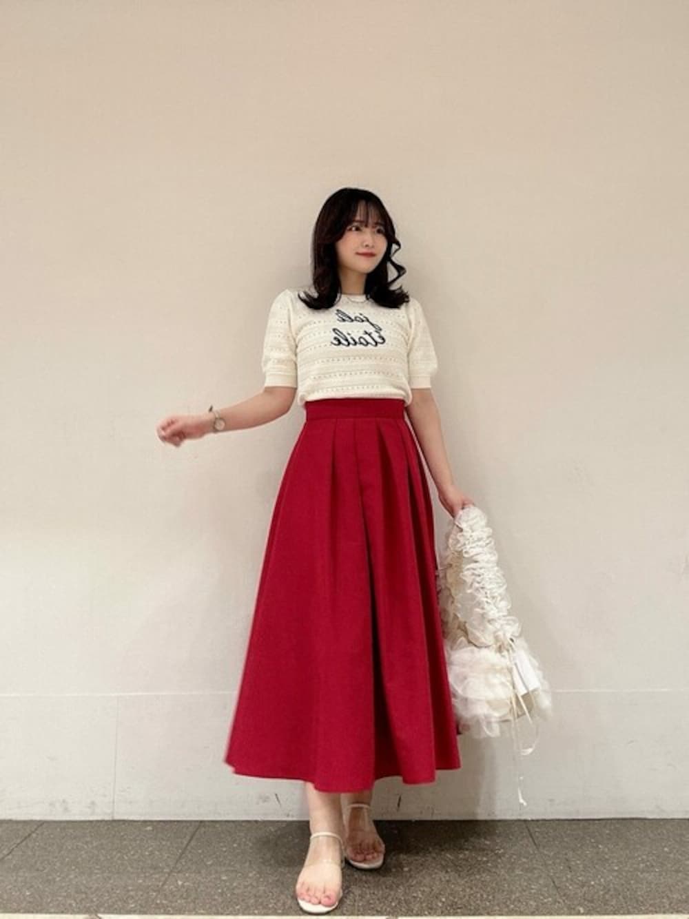 STAFF身長:156cm 【着用サイズ】トップス:FR/スカート:M 《ニット》 ロゴがパッと目を惹くニットトップスは、コーデのアクセントになります♪ 通気性の良い素材なので、夏場も着用いただけます! コンパクトなサイズ感なので、バランス良く合わせていただけるのもポイント♡ 《スカート》 タックが入っているので、ふんわり広がるシルエットがウエストの華奢さを強調してくれます♡ 後ろはゴールドのファスナーが付いており、キラッと上品さもプラスしてくれます! 着用のレッドは華やかでアクセントになり、着るだけで気分が上がります♪