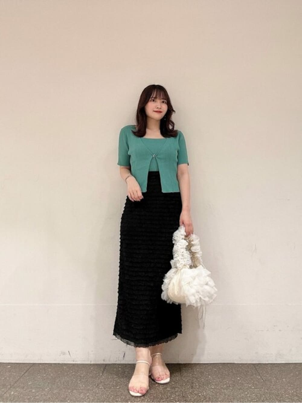 STAFF身長:156cm 【着用サイズ】ニット:FR/スカート:S 《ニット》 カーデとキャミがセットになったアンサンブルは、着るだけでこなれ感を演出してくれます♡ さらっとした素材なので、ニットでも涼しげに着用していただけます! カジュアルにもキレイめにも合わせていただけるので着まわし力抜群です♪ 《スカート》 フリルデザインが大人フェミニンなタイトスカートです♡ ウエストはフィット感のあるゴムを使用しており、キュッとメリハリのあるシルエットでお召しいただけます! 裏地が少し短めなので、足元の透け感が涼しげな印象になります♪