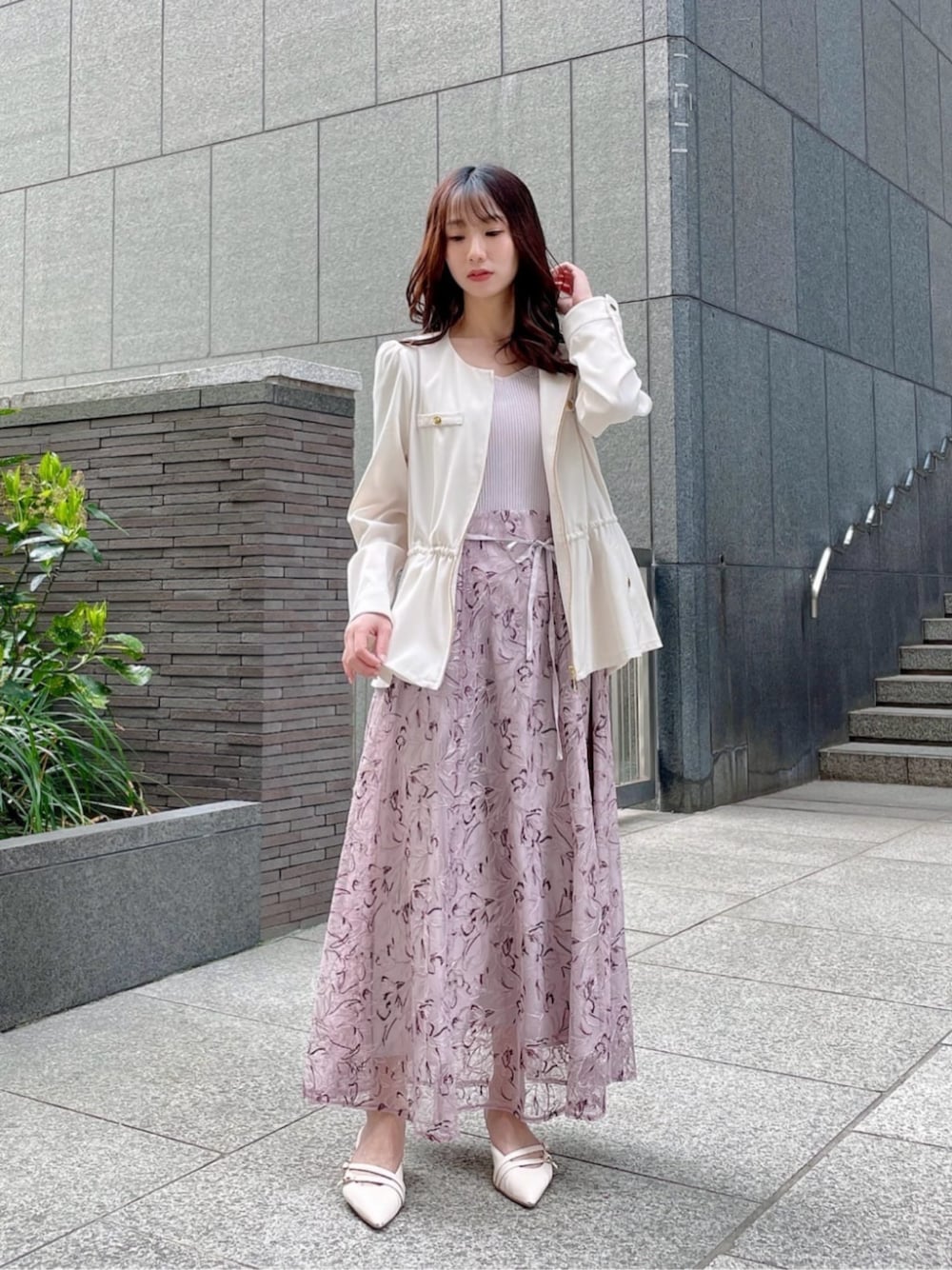 STAFF身長:153cm 【着用サイズ】アウター:S/ワンピース:S 《ペプラムブルゾン》 とろみのある薄地で春〜夏場にも活躍するライトアウターです。程よいペプラムデザインで腰周りをカバー&スタイルアップ効果も◎ジャストシルエットなのでキレイめなアイテムと相性バツグンです。 《チュールフラワーニットドッキングワンピ》 表面感のあるフラワー刺繍が高見えポイントの華やかワンピースです◎サイドファスナー&裏地に仕込んだウエストゴムでくびれラインをキュッと細く見せてくれる所も嬉しい1枚。 身長153cmでSサイズを着用しており、着丈は足首上と小柄さんでも着こなしやすい長さです!