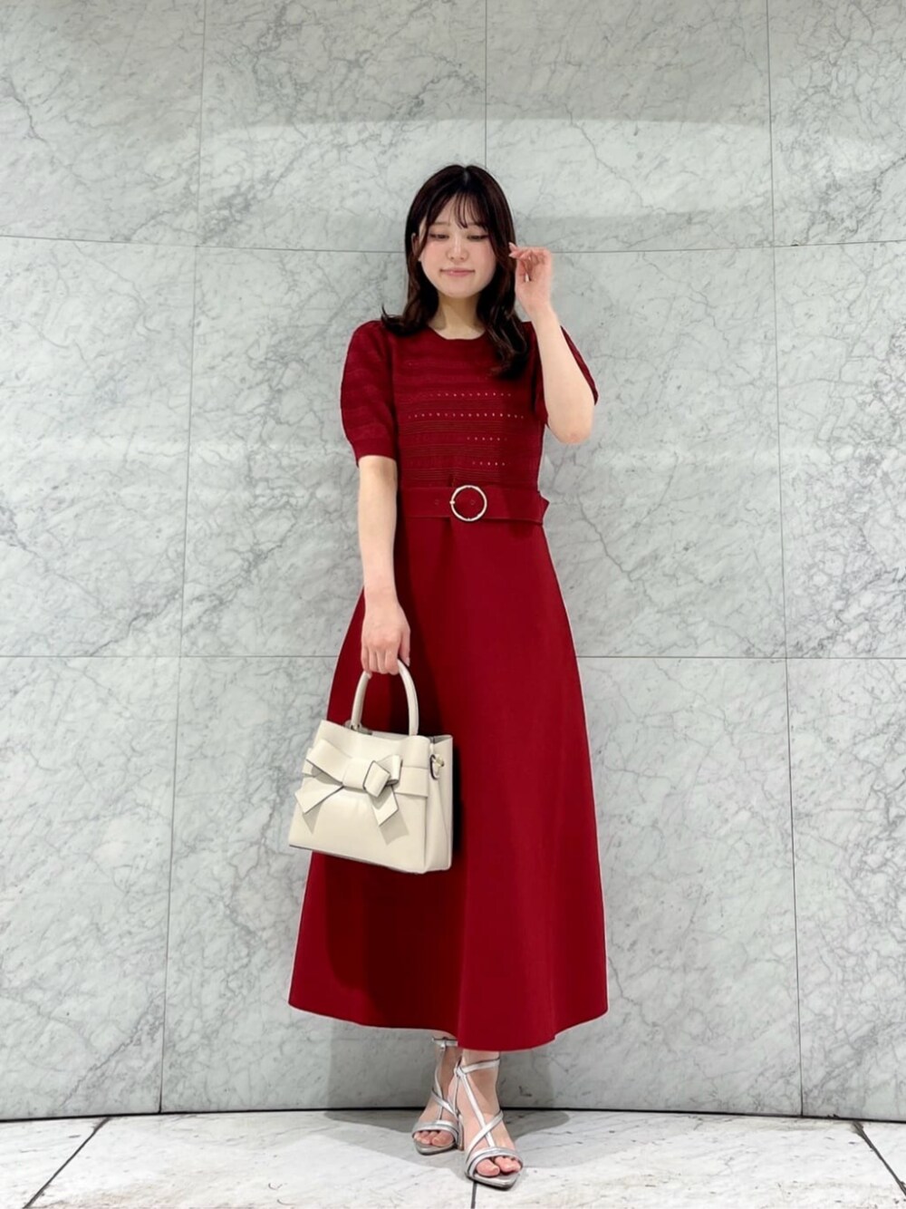 STAFF身長:153cm 【着用サイズ】ワンピース:S 《ワンピース》少しハリのあるサラッとした生地が立体的なフレアラインを出してくれるので、体のラインを拾いすぎず360度キレイなシルエットでお召しいただけます!トップス部分は少し透け感のあるボーダーライクなデザインになっており、シンプルなインナー合わせがおすすめです◎袖の程よいパフスリーブや、少し高めの位置のベルトデザインなど、1枚で美シルエットが叶うこだわりの詰まったアイテムです♡デニムジャケットとカゴバックでカジュアルにも、キレイめヒールと小さめバッグで上品なコーデにもぴったりです♪