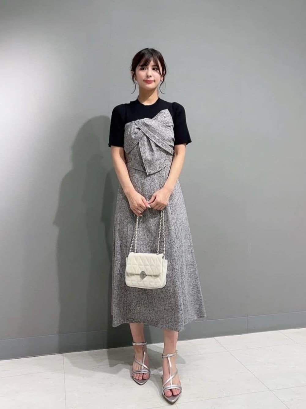 STAFF身長:159cm 【着用サイズ】ワンピース:S 《ワンピース》店頭でも既に大人気のドッキングワンピースです! 胸元のリボンは上品見えするようこだわられており、1枚で着映えするデザインになっています! ハイウエストなので着るだけでスタイルアップが叶うのも嬉しいポイントです♡ サマーツイードを使用しているのでさらっと楽な着心地でお召しいただけます! 胸元のデザインがポイントなので、ヘアスタイルはアップにするのがおすすめです◎