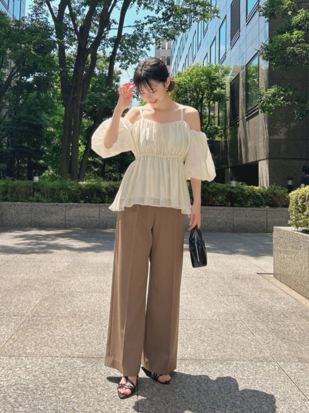 STAFF身長:161cm 【着用サイズ】トップス:M /パンツ:M 《シャーリングオフショルブラウス》ほどよいボリューム感が女性らしさを引き立てる、オフショルダーブラウス✨胸下にはゴムを施し、動きやすさと快適な着心地を実現。軽やかなシアー素材が、上品な肌見せを叶えながら、大人の可愛さを引き立てます。フロントだけではなく、背中のリボンとシャーリングでバックスタイルもお洒落に見せてくれます! ヒップにかかるやや長めの丈感で、気になる後ろ姿もさりげなくカバーしてくれます♡ 《ベーシックワイドパンツ》太すぎない絶妙なワイドシルエットで、ヒールやスニーカーコーデにもマッチする万能パンツ✨ センタープレスが脚のラインを美しく見せ、スタイルアップも叶えてくれます。後ろウエストはゴム仕様で、快適な履き心地◎ ウエストまわりはタックインスタイルにも映えるデザインで、ブラウスやニットを合わせてもバランス良く着こなせます。