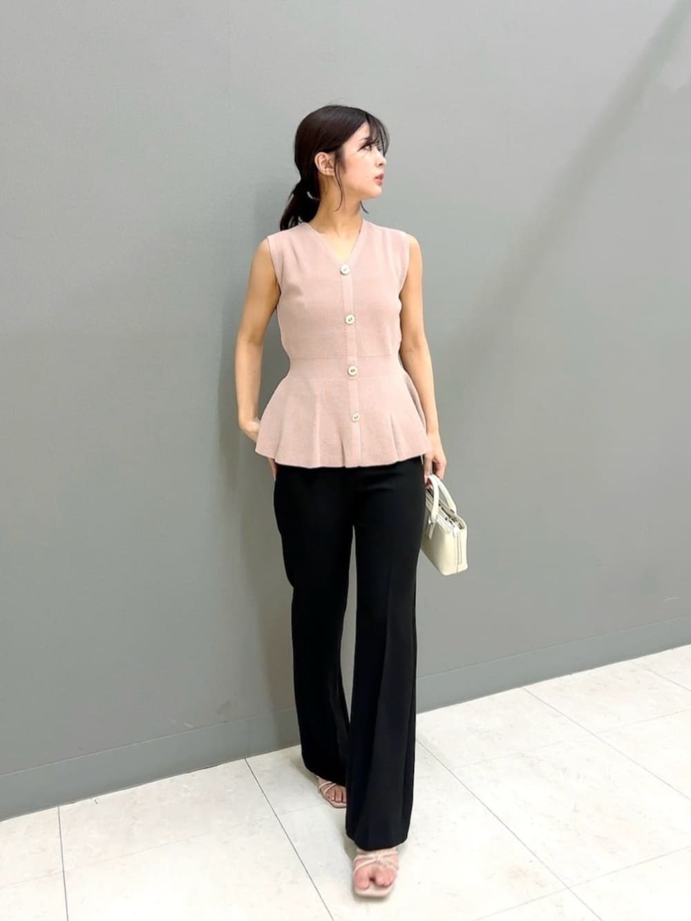 STAFF身長:159cm 【着用サイズ】トップス:FR/パンツ:S 《トップス》ペプラムシルエットでトレンド感満載のニットです!ウエスト位置高めで切り替えがあるのですっきりとしたシルエットで着用できます!ゴールドのボタンがアクセントになり華やかな雰囲気に仕上がります!程よく開いたVネックが涼しげな印象に♡伸縮性もあるので着心地も楽ちんです◎ 《パンツ》着回し力抜群の美シルエットパンツです!フレアシルエットなので着るだけで脚長効果抜群です◎気になるヒップや腰回りはラインを拾いすぎないよう計算されており、骨格ウェーブさんにもおすすめです!ポリエステルが多く入っており、シワになりにくくお洗濯も可能とお取り扱いもしやすくなってます!合わせるトップス次第でオンオフどちらも着用できます♡