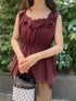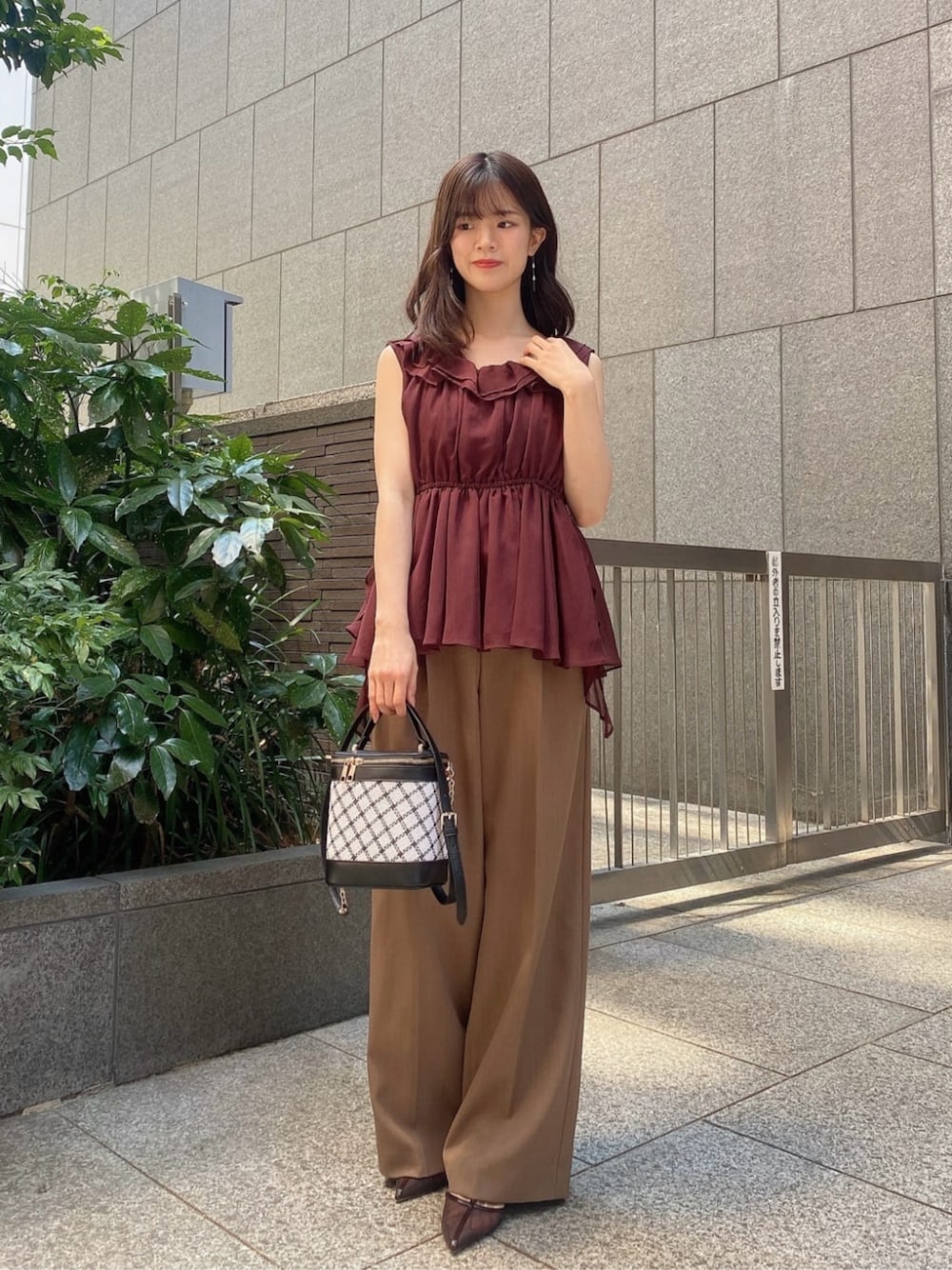 STAFF身長:158cm 【着用サイズ】トップス:FR/ボトムス:S 《トップス》トレンドの縦フリルがポイントの華やかブラウスです。シフォン楊柳素材の軽やかな透け感と表情のある風合いが女性らしく、ウエストゴムで自然とメリハリのあるシルエットを作ってくれます。温かみと上品さを感じさせる赤みブラウンのカラーは肌馴染みもよく、晩夏に向かうこれからの季節にぴったりです🤎 《ボトムス》程よいハリと落ち感のある素材で、きちんと感とリラックス感を両立したワイドパンツです。ウエストはバックゴム仕様でラクなはき心地🌱タックとセンタープレスが入っており、脚のラインをすっきりと見せてくれます。 通勤スタイルはもちろん、Tシャツやブラウスを合わせたカジュアルダウンも!オンにもオフにも頼れる、一本あると便利なアイテムです。 身長158cm/Sサイズ着用、3センチヒールの靴を履いています。