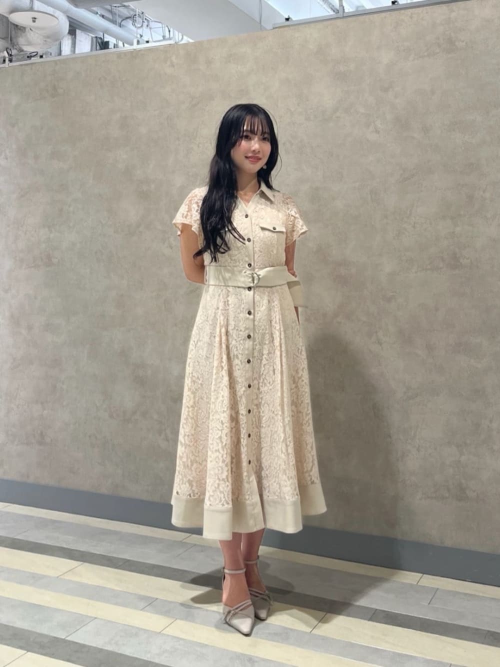 STAFF身長:154cm 【着用サイズ】 ワンピース: PS 上品な総レースを使ったワンピースで、大人っぽい印象で着ていただけます!ウエストベルトがついているので、スタイルアップできるのも嬉しいポイント◎身頃には裏地がしっかりついていますので、透ける心配もありません。 身長154cmで足首しっかり見えるPSサイズもあるので、ヒールだけでなく、フラットシューズやローヒール合わせもおすすめです!
