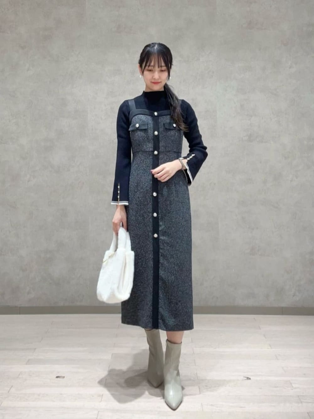 STAFF身長:164cm 【着用サイズ】トップス:S /ワンピース:S ブラックコーデにブーツで抜け感を出した大人綺麗めコーデです♡ ジャンスカは後ろにゴムが入っている為、締め付け感なく着ることができます! 164cm、Sサイズ着用でふくらはぎの真ん中、ミモレ丈です。