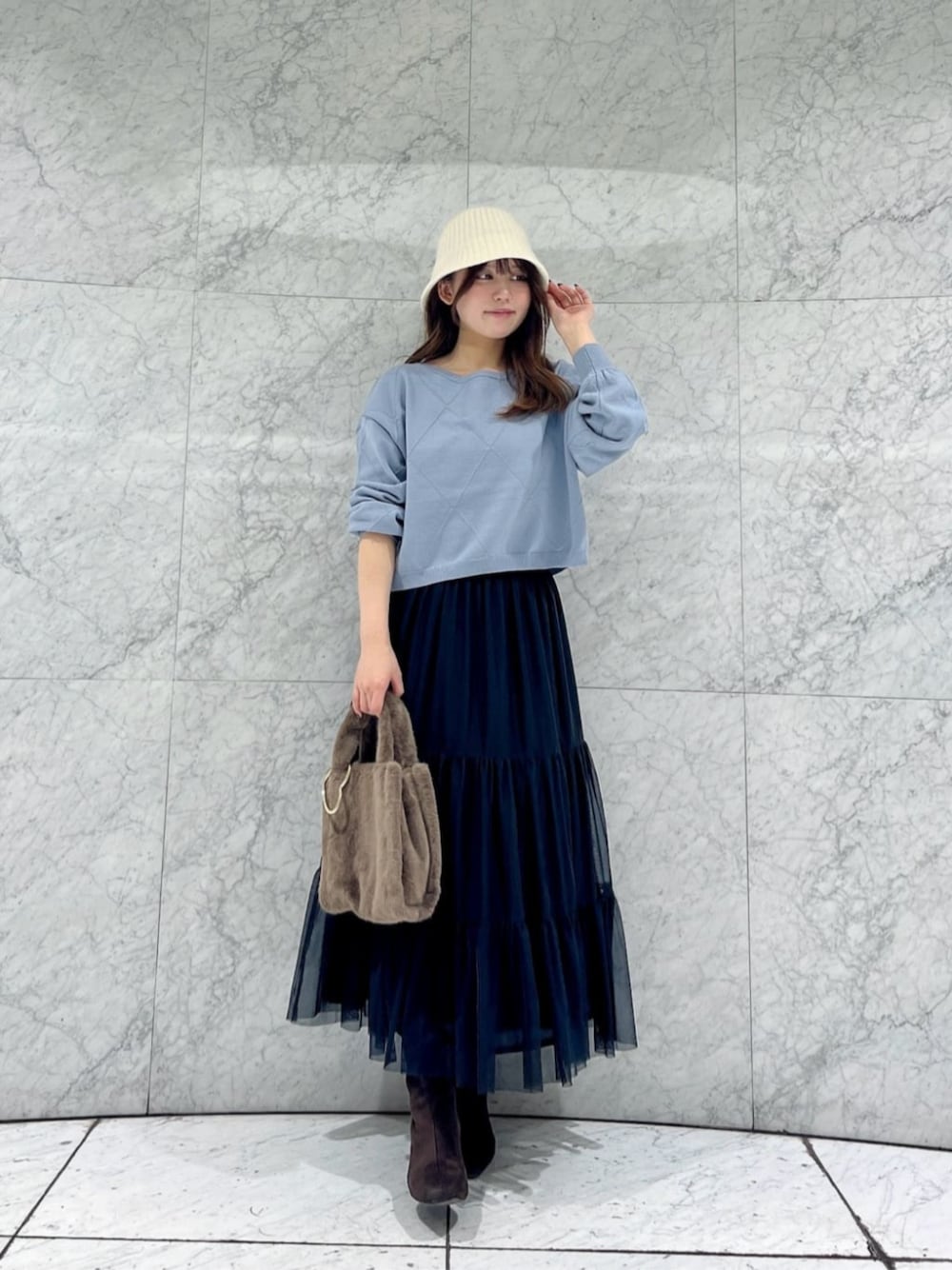 STAFF身長:153cm 【着用サイズ】トップス:FR/スカート:PS 《トップス》毎年人気のダイヤ柄デザインです!前はインしてスッキリ着ていただけますが、後ろが少し長めになっているので、パンツと合わせても気になるヒップ周りをカバーしてくれます♪ 《スカート》プロポーションらしいシアー感とティアードデザインが目を惹くアイテムです♡今年は短丈のニットやカーディガンを合わせてカジュアルなスタイリングもおすすめです♪ PSサイズで足首あたりの着丈なので、これからの時期ブーツなどとも相性バッチリです◎