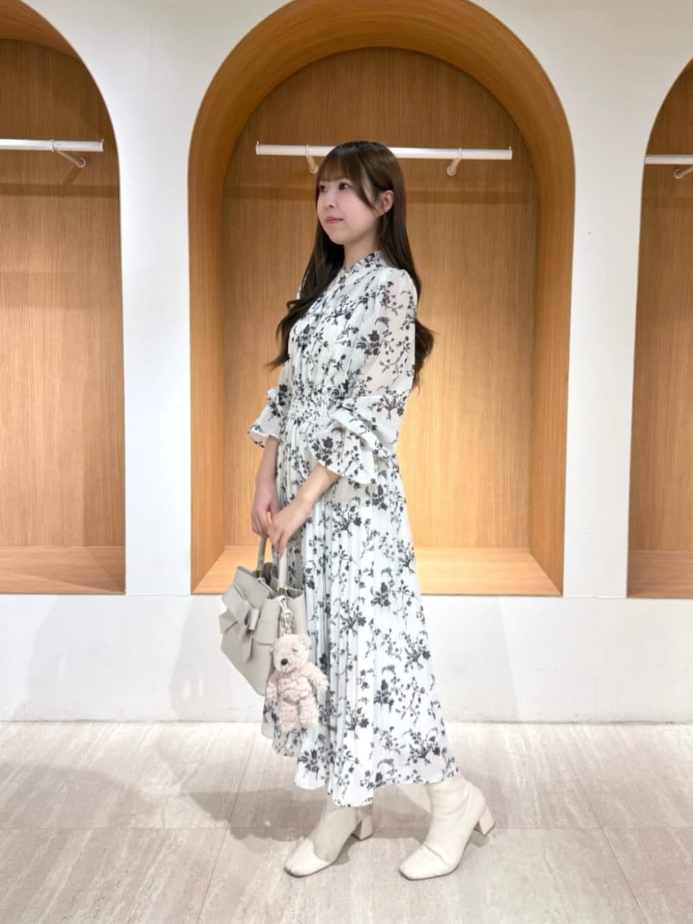 STAFF身長:155cm 《着用サイズ》ワンピース:PS 《ワンピース》 オリジナルの花柄を使用したプリーツワンピース。襟のミニフリルとリボン、キャンディースリーブがフェミニンな雰囲気を叶えます♪ スカート部分は細すぎないプリーツ幅にしており、体のラインをカバー。ウエストはゴム仕様ではき心地が良く、被りで着脱できます! デイリーから華やかなシーンまで着ていただけます♡ 身長155cmで足首が見えて、ブーツでもフラットシューズでも合わせやすい丈感です♪