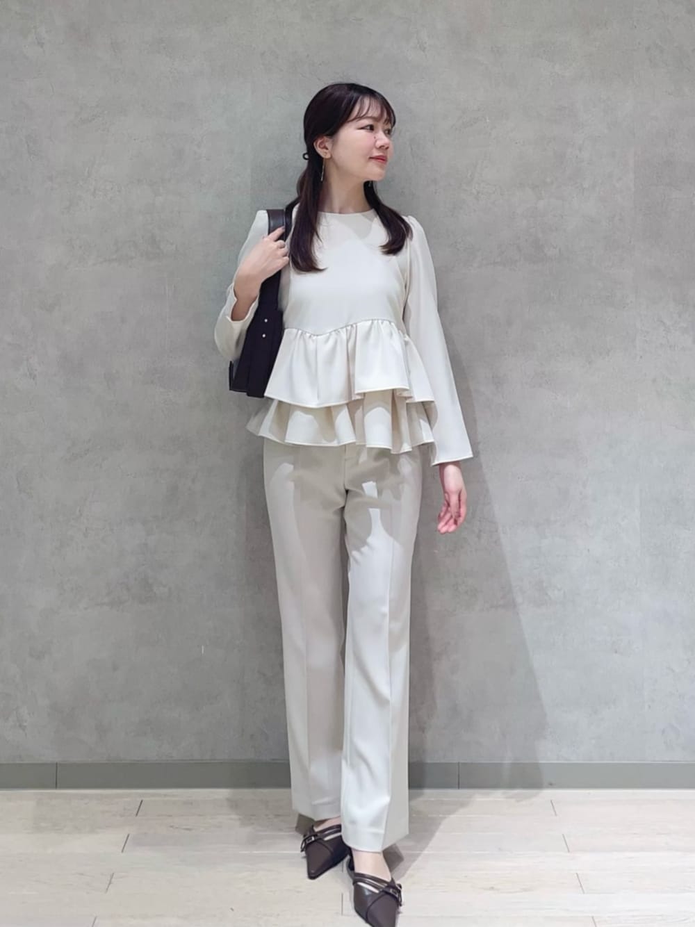 STAFF身長:154cm 【着用サイズ】トップス:S/パンツ:PS 《ランダムヘムペプラムブラウス》 裾のフリルが気になりがちなお腹周りをカバーしつつ、スタイリングを華やかな印象にしてくれます✨ ウエスト後ろにゴムも入っているので着脱もしやすく、着ていても動きやすいです◎ 《美脚パンツ》 フロントにタックが入っているので脚のラインを拾いすぎずに履けます。 サラッとした素材なので季節問わず履いていただけます◎ 濃い色の下着だと若干透け感がありますがベージュや白系を履けば気にならないのでおすすめです! 154cm、PSサイズ着用でくるぶし丈です。素足でも床に付かない丈でした。