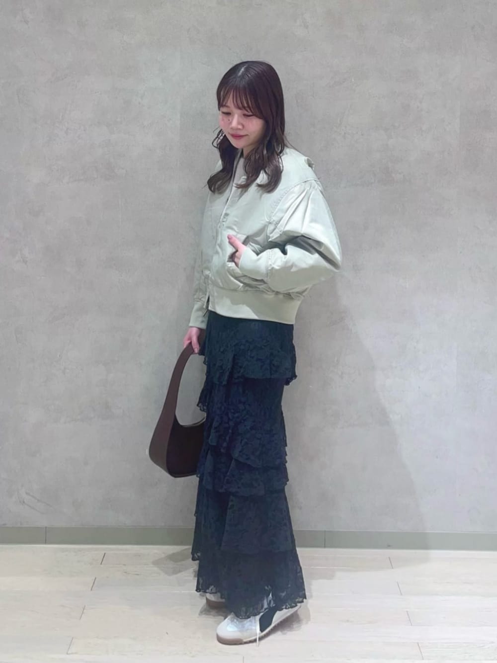 STAFF身長:154cm 【着用サイズ】ブルゾン:S/スカート:PS 《中綿ブルゾン》 重たくなくサラッと羽織れるブルゾンです!コンパクトな着丈ですっきり着れるのでカジュアルになりすぎずに着れました◎ 《ランダムティアードレーススカート》 レースのティアードが華やかな印象で着れますがボリュームが出すぎないのですっきり着ていただけます! 154cm、Mサイズ着用でくるぶし隠れる丈です。ウエストはゴムが入っているので意外と大丈夫でしたが、すっきりお召しになりたい方はPSサイズがおすすめです。