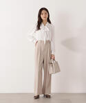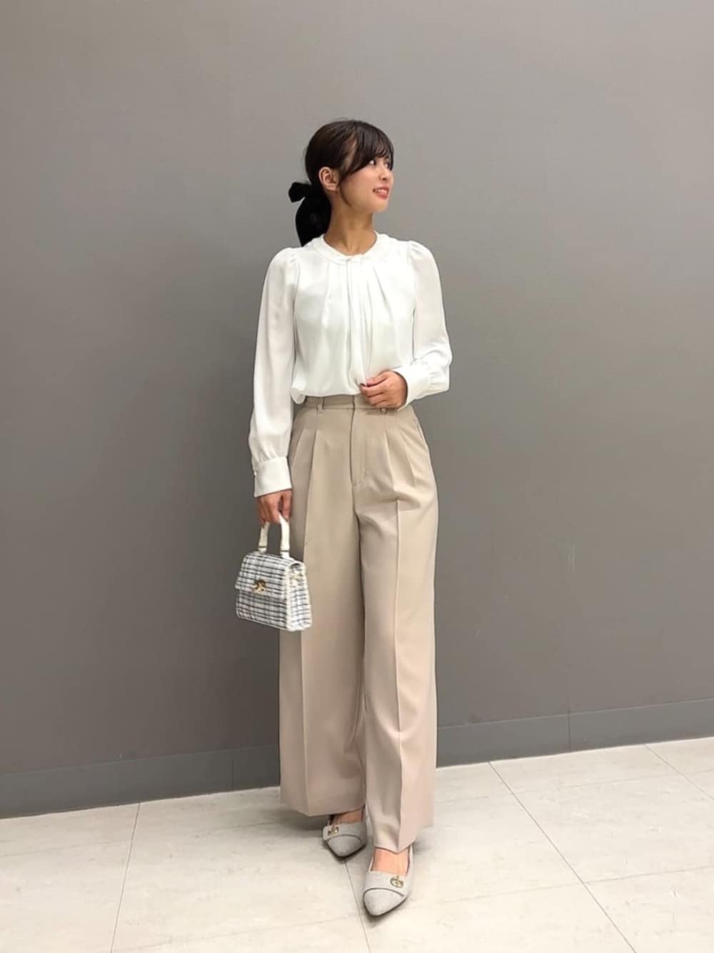 STAFF身長:159cm 【着用サイズ】ブラウス:S/パンツ:PXS(PSS) 《パール付きベーシックブラウス》 ベーシックながらもフロントタックとパールがアクセントになり、お洒落なオフィススタイルに仕上がります✨ 素材感: とろみのある上品見えする素材感。透け感も気にならず着用できました! サイズ感: 普段着用のサイズがおすすめになります! 《2タックワイドパンツ》 センタープレスできちんと感&脚長効果◎ 同素材のジャケットと共にPXSサイズまであるので華奢な方、小柄な方におすすめです♡ 素材感: 防シワ加工入りでお取り扱いもしやすくなっています! サイズ感: PXSサイズ着用でくるぶしが隠れる着丈でした。