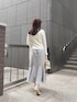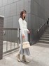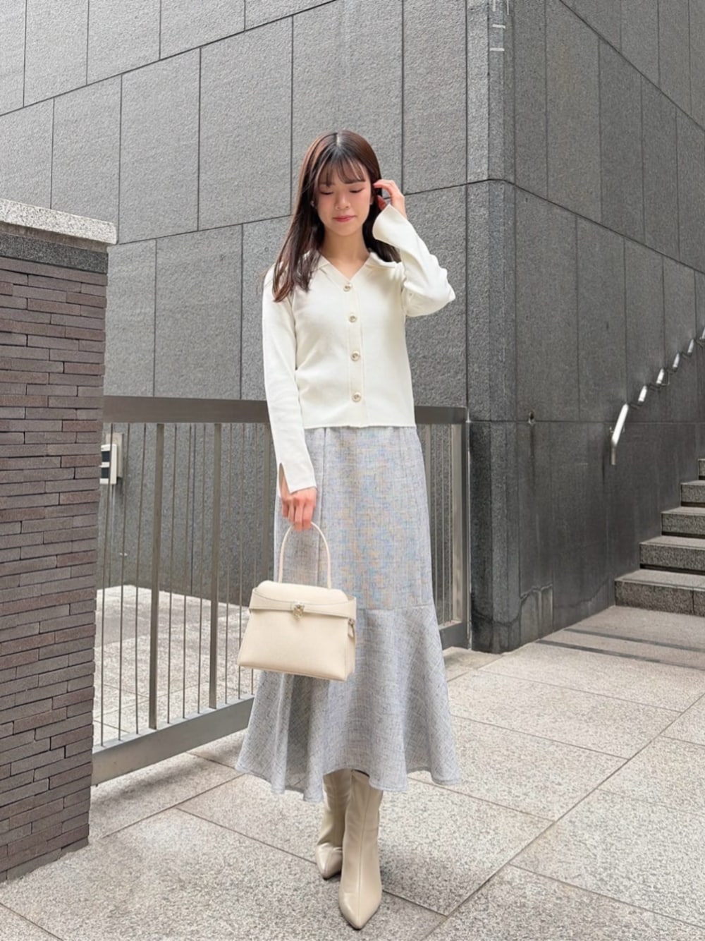 STAFF身長:158cm 【着用サイズ】ニット:S/スカート:PS 《コーディネートポイント》 コンパクトなニットトップスに、揺れ感のきれいなマーメイドスカートを合わせた 女性らしさが引き立つきれいめスタイル。 淡いカラー同士でまとめることで、柔らかく上品な印象に仕上げました。 シンプルながらも、シルエットで華やかさを感じられるコーディネートです。 【着用感】 ●トップス(Sサイズ着用) 身幅はすっきりめで、身体に程よく沿うサイズ感。 着丈はウエストにかかるくらいなので、スカート合わせでもバランスが取りやすいです。 袖丈は手首が隠れる長さで、上品な印象。 柔らかく伸びのある素材で、窮屈感なく着用できます。 ●ボトムス(PSサイズ着用) 158cmで足首がしっかり見える丈感。 フラットシューズでも引きずらず安心です。 ウエストは後ろゴム仕様で程よくフィットし、座ったときも窮屈感はありません。 軽やかなツイード素材で動きやすく、長時間のお出かけにも◎ 裏地付きで透け感を気にせず着用できます。