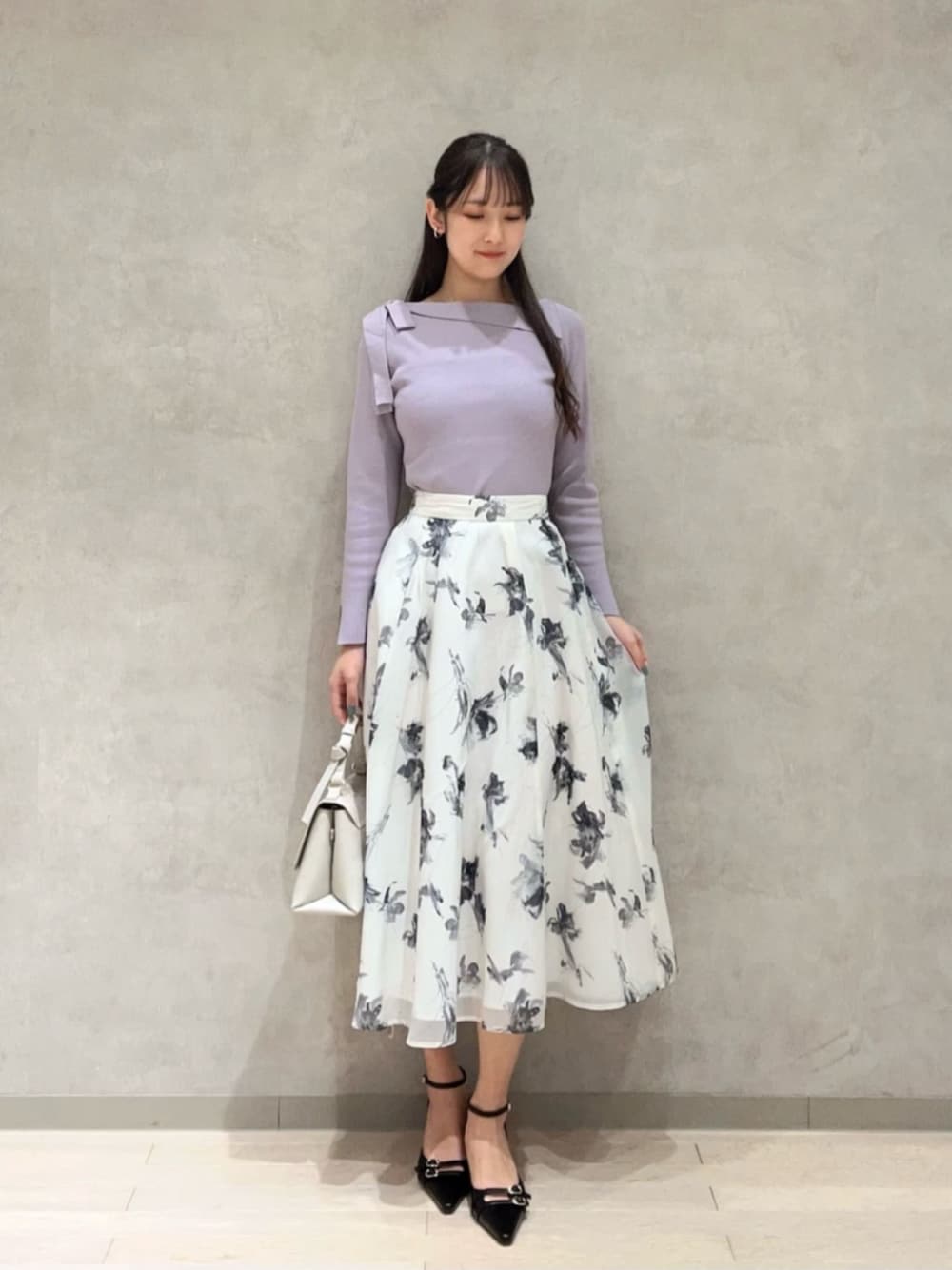 STAFF身長:164cm 【着用サイズ】トップス:S /ボトムス:S 《スタイリング》 春らしいラベンダーのニットに甘くなり過ぎないようにスカートとパンプスで大人可愛いを演出しました! プロポーションらしいスタイリングです♡ ◎サイズ感 スカートは身長164cmSサイズ着用でふくらはぎの半分くらいの丈感です。